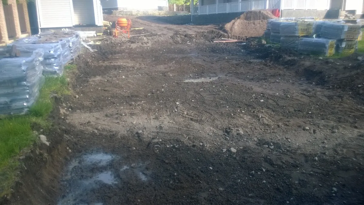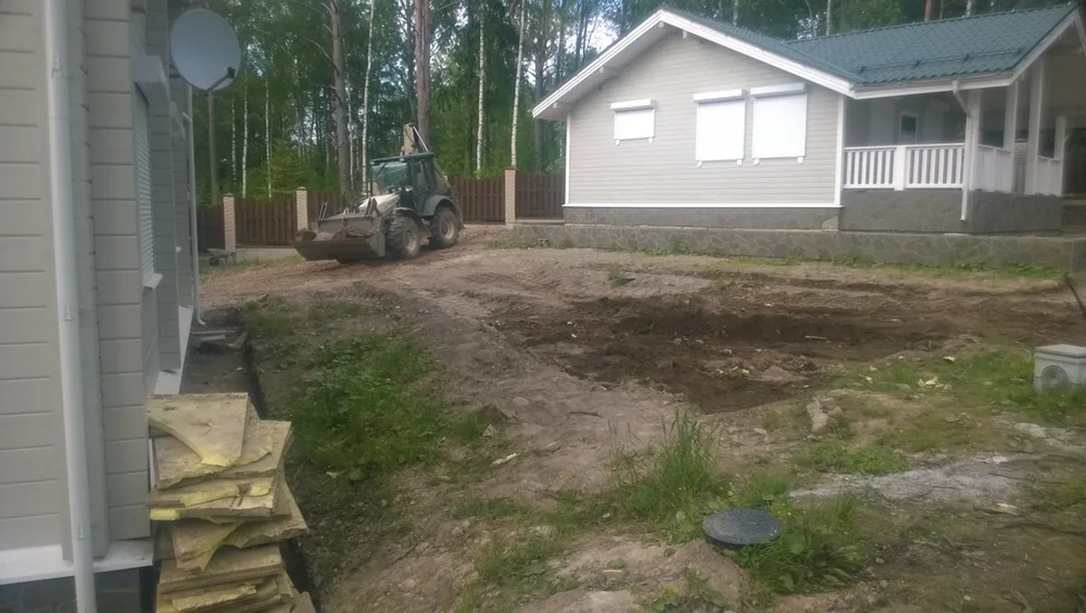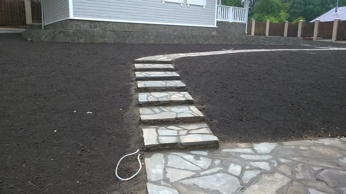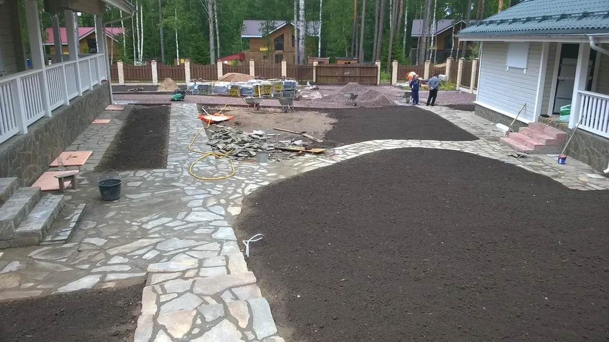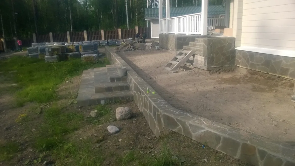 Начали с планировки участка трактором, вывезли весь лишний грунт. Далее подготовили основание под мощение, параллельно прокладывая необходимые трубы под отвод ливневых вод. Заложили кабель под освещение. Забетонировали и облицевали песчаником 2 лестницы.