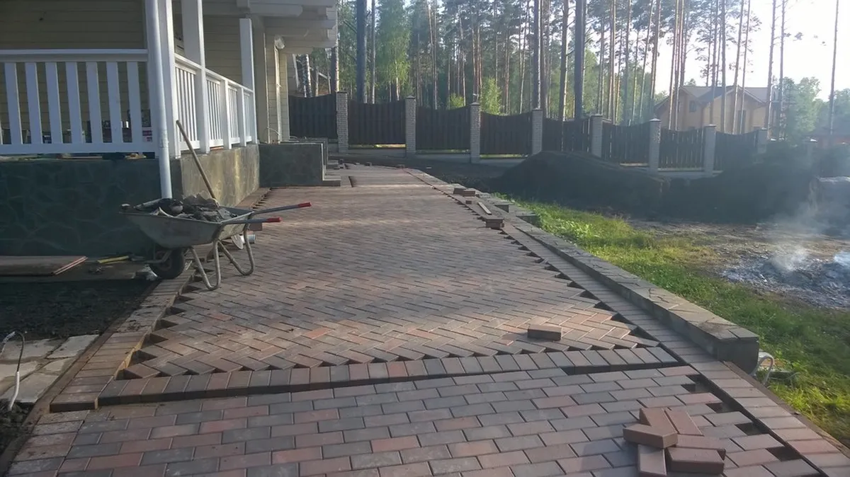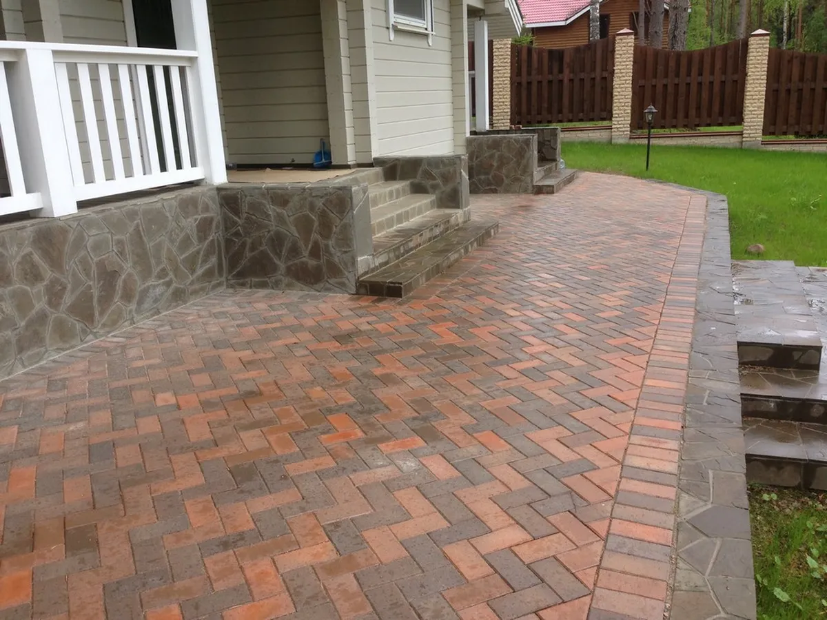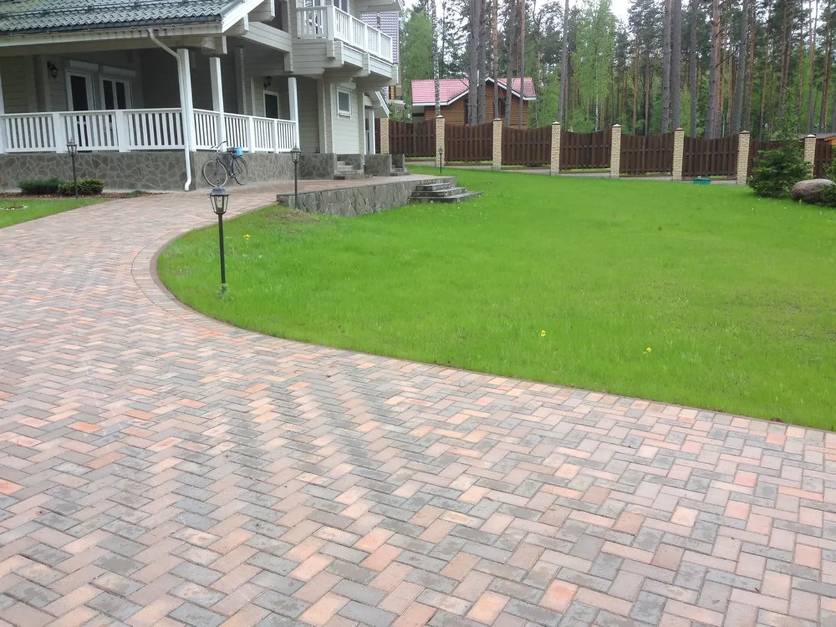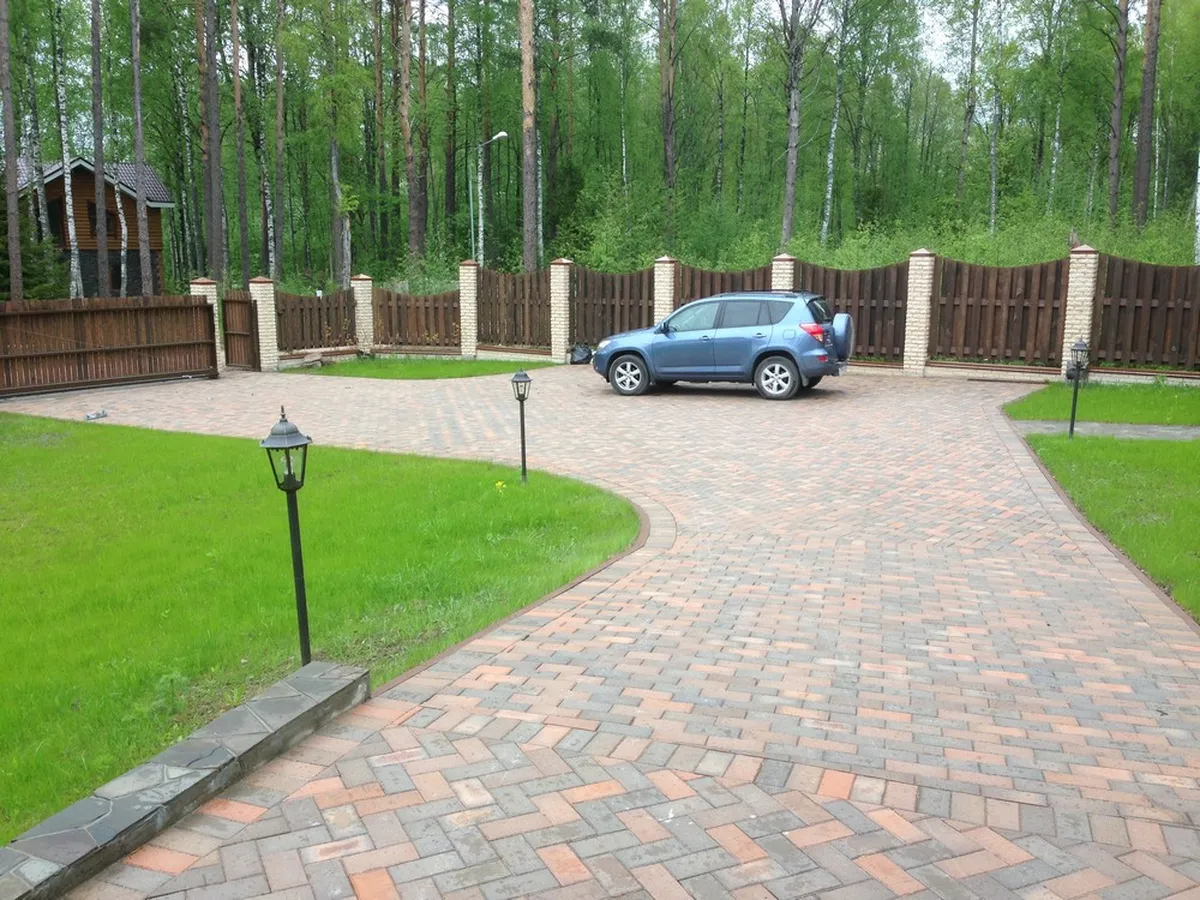 Для мощения автомобильной дороги укладывали клинкерную тротуарную плитку, с установкой бетонного бордюра по периметру. В качестве покрытия пешеходных дорожек и отмостки использовался натуральный песчаник.