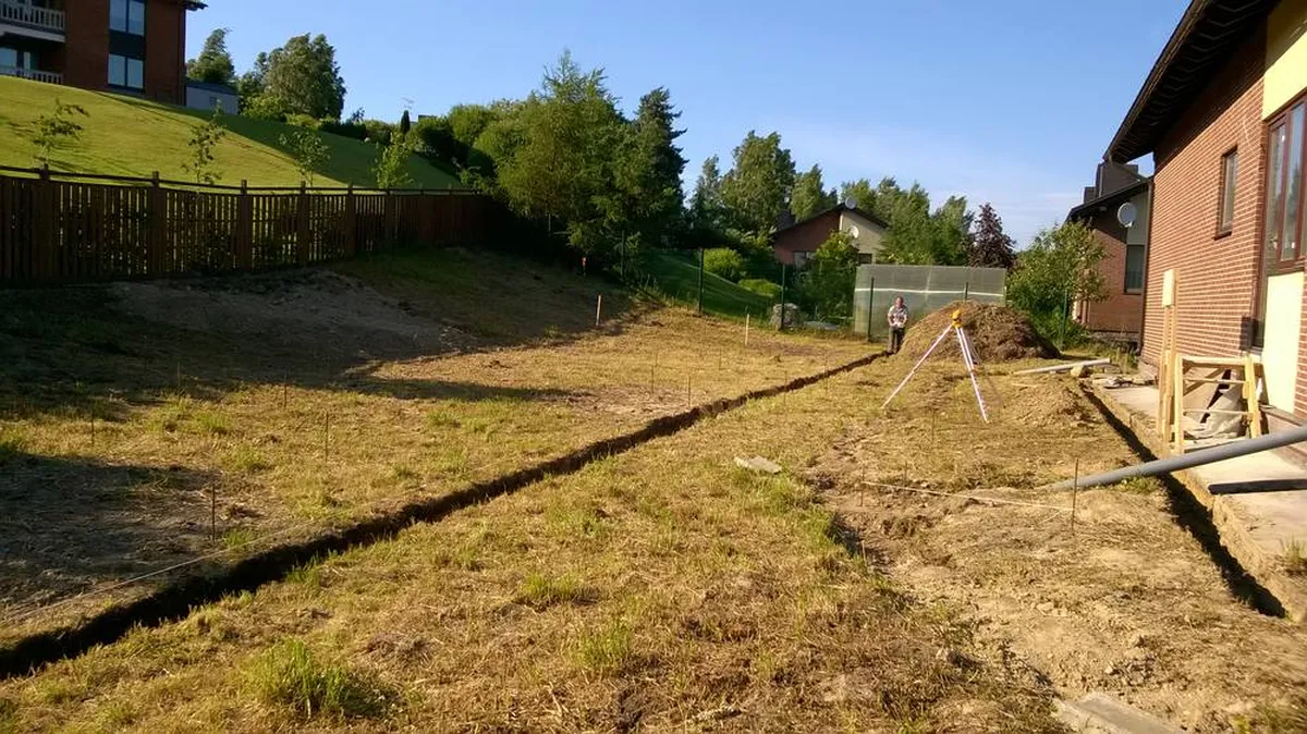Начали с разбивки и вертикальной планировки. Участок расположен на склоне, соответственно, без лестницы было никак не обойтись. По двум сторонам дома было забетонировано 2 лестницы.