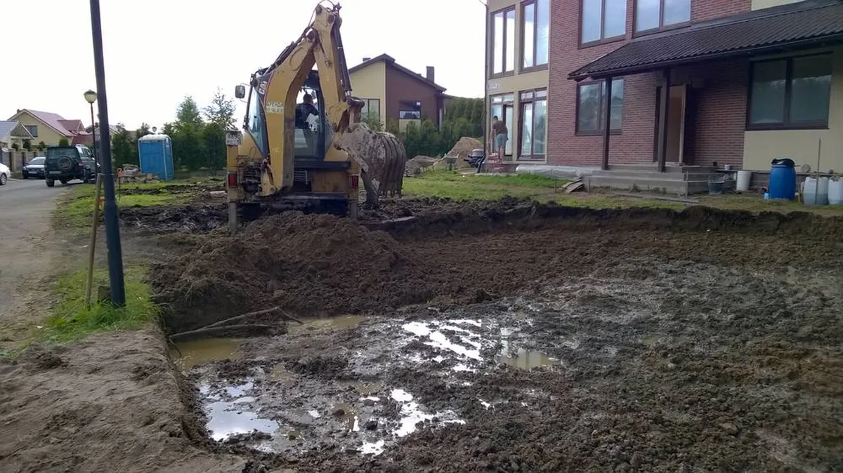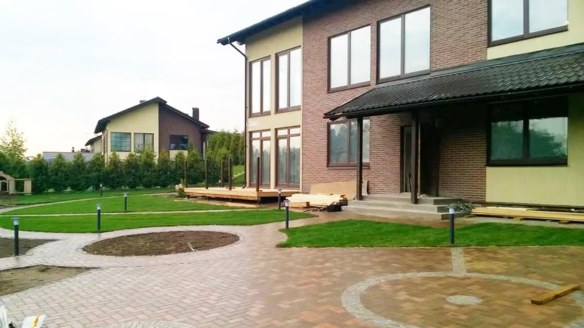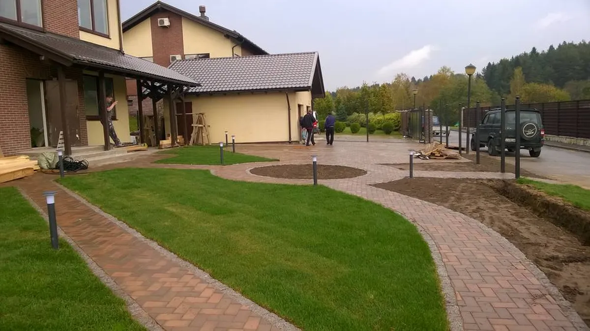 На участке имелся небольшой склон, который необходимо было спланировать по отметкам, укатать, и укрепить с использованием георешетки. Затем были проведены земельные работы, связанные с дренажем, прокладкой труб ливневой канализации с установкой смотровых колодцев, прокладкой кабеля для освещения участка и подготовкой основания под мощение. Мощение выполнено из клинкерной тротуарной плитки и натурального камня (гранитной брусчатки), в комбинированном варианте.