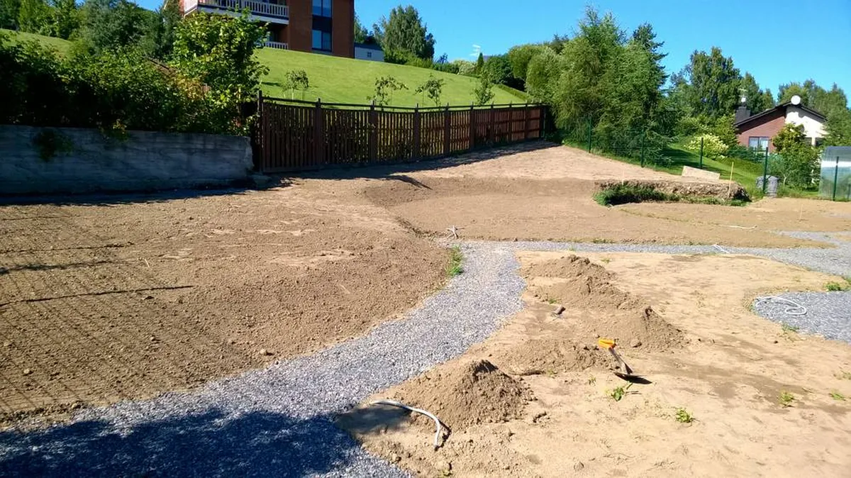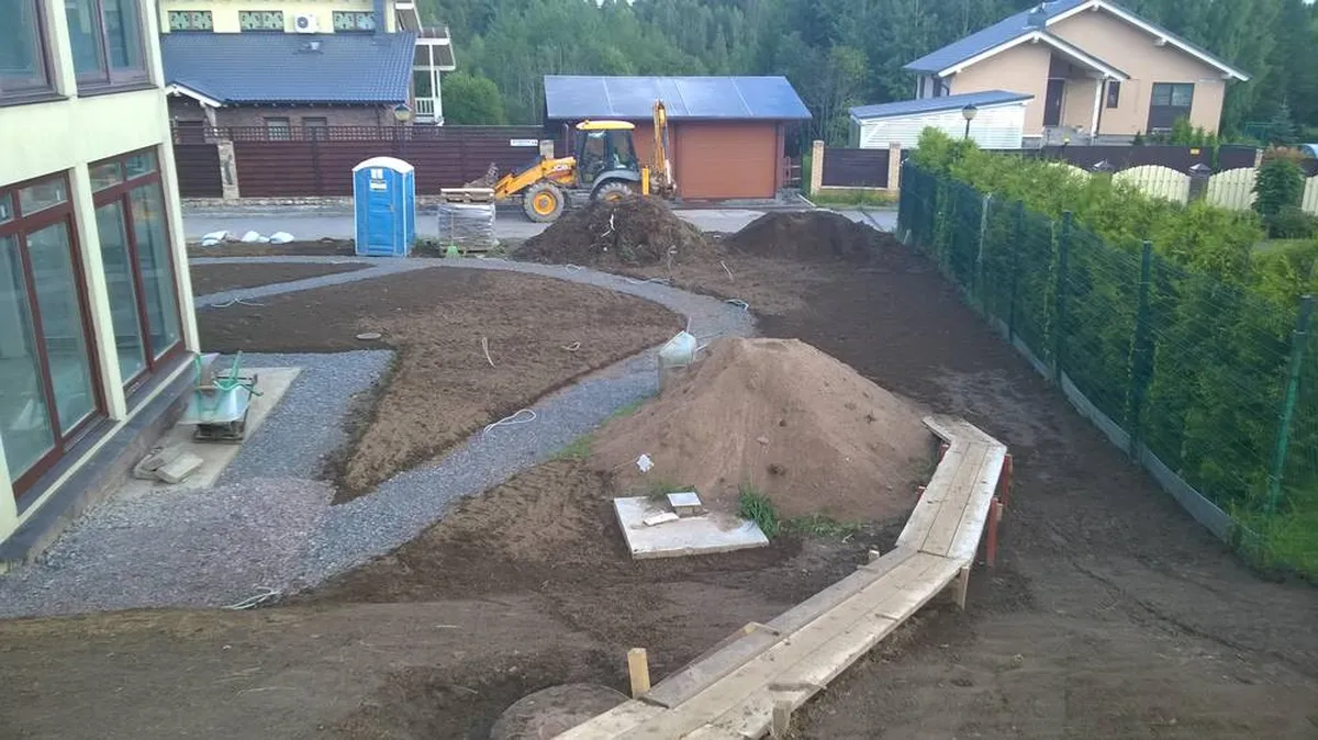 На этом рельефном участке площадью 20 соток перед нами стояла задача - полностью благоустроить участок и выполнить частичное озеленение участка