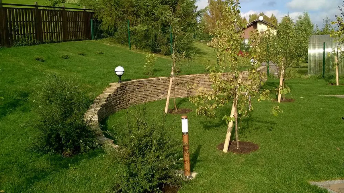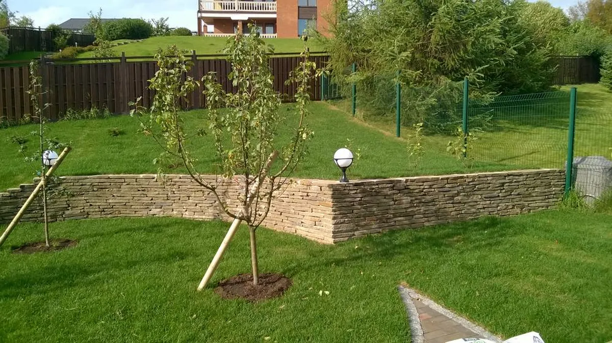 Выполненные работы по ландшафтному дизайну территории 20 соток: земляные работы (планировка участка и склона), подготовка песчано-щебеночного основания с трамбованием, укрепление склона георешеткой, бетонирование лестницы для подъема на участок, облицовка натуральным камнем (песчаник), устройство декоративной подпорной стенки из песчаника, мощение клинкерной тротуарной плиткой с гранитной брусчаткой, устройство ливнеотвода, декоративное освещение, монтаж террасы, укладка рулонного газона, озеленение.