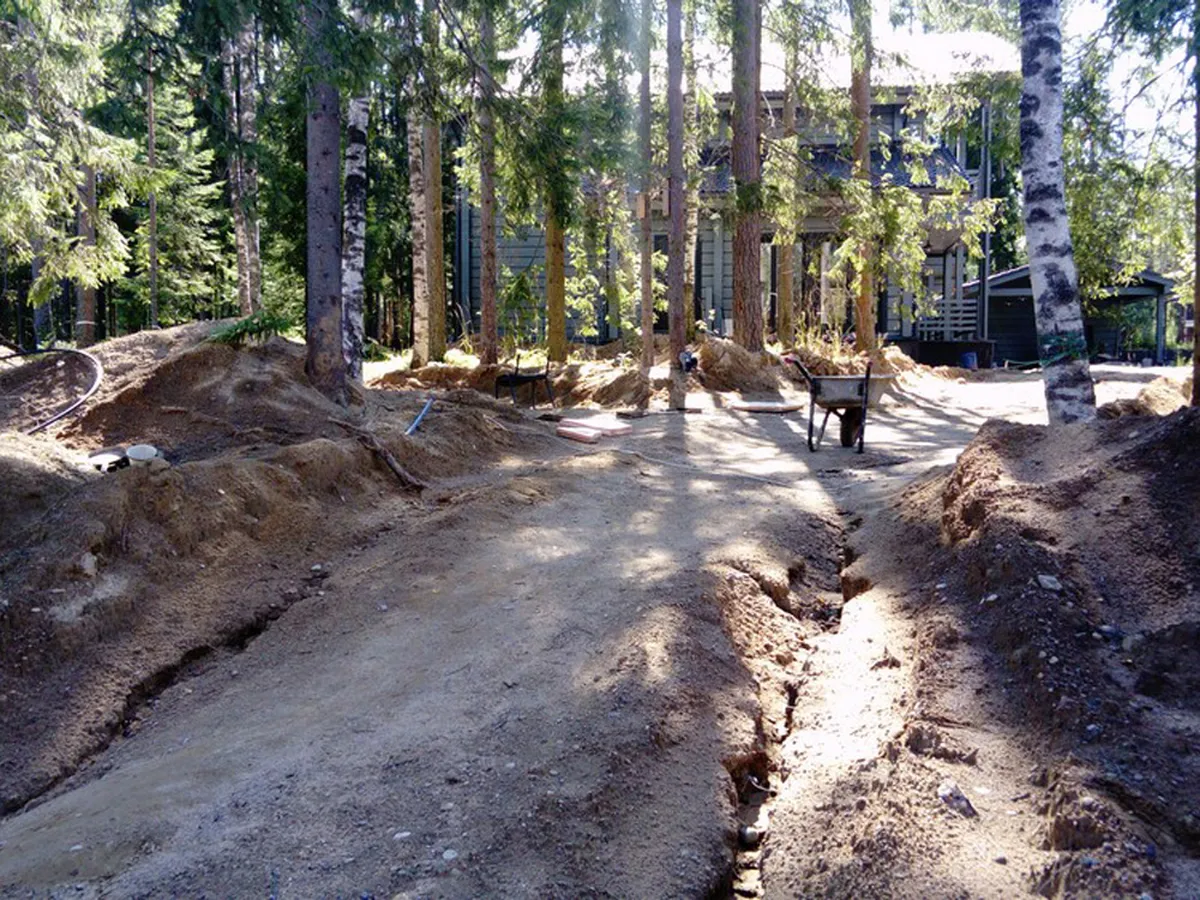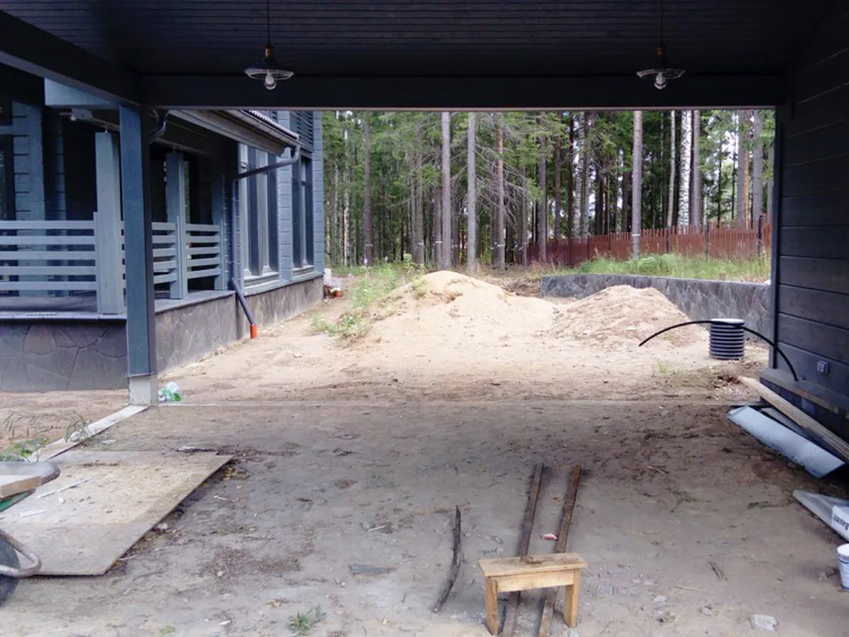 Сделали дренаж и прокладку труб для ливневой канализации. Также установили смотровые колодцы, и проложили кабель для освещения участка.