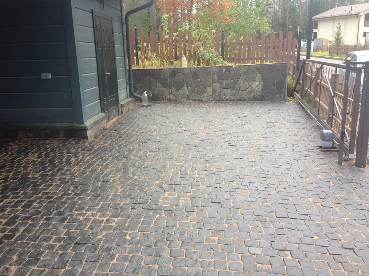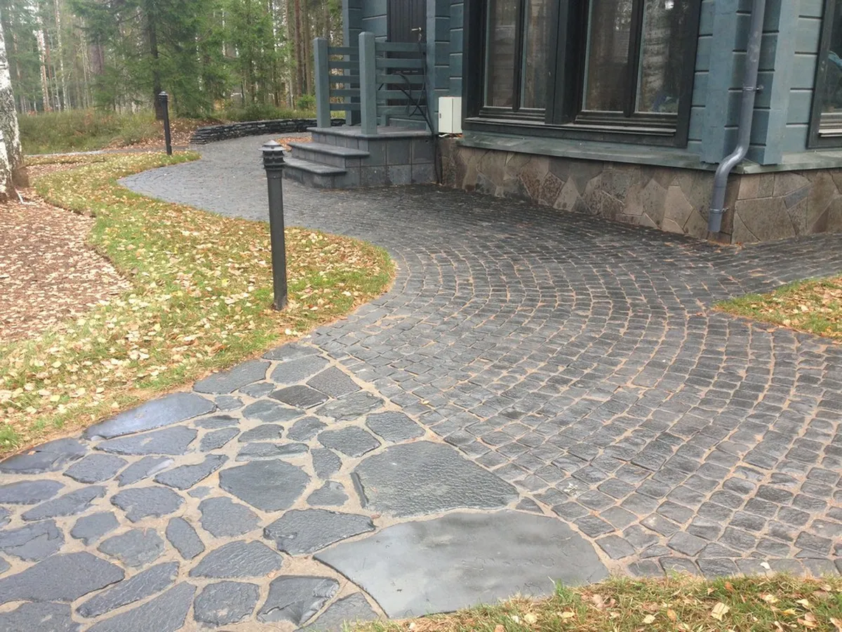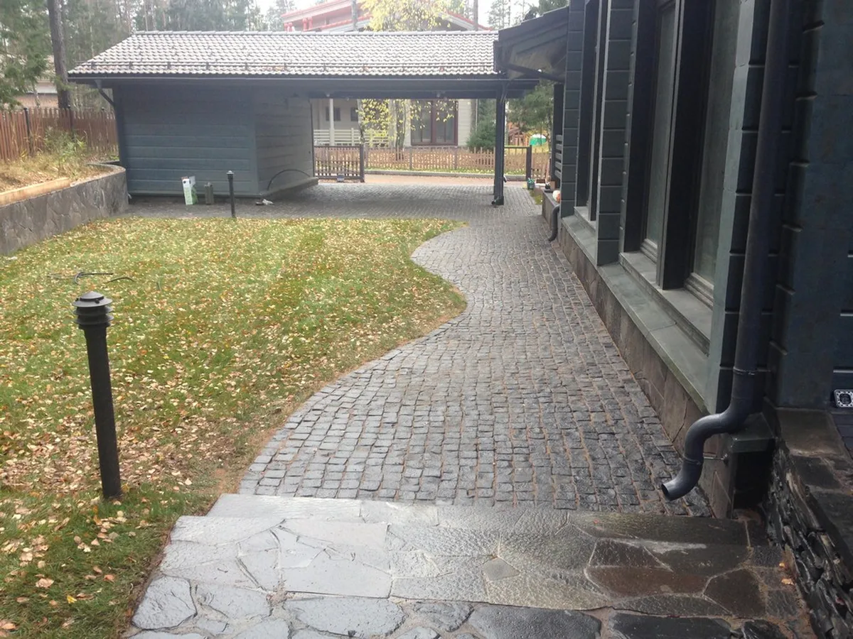 Мощение полностью выполнено из натурального камня, гранитной брусчатки (диабаз) и шунгита (галтованный, рваной формы) в комбинированном варианте.
