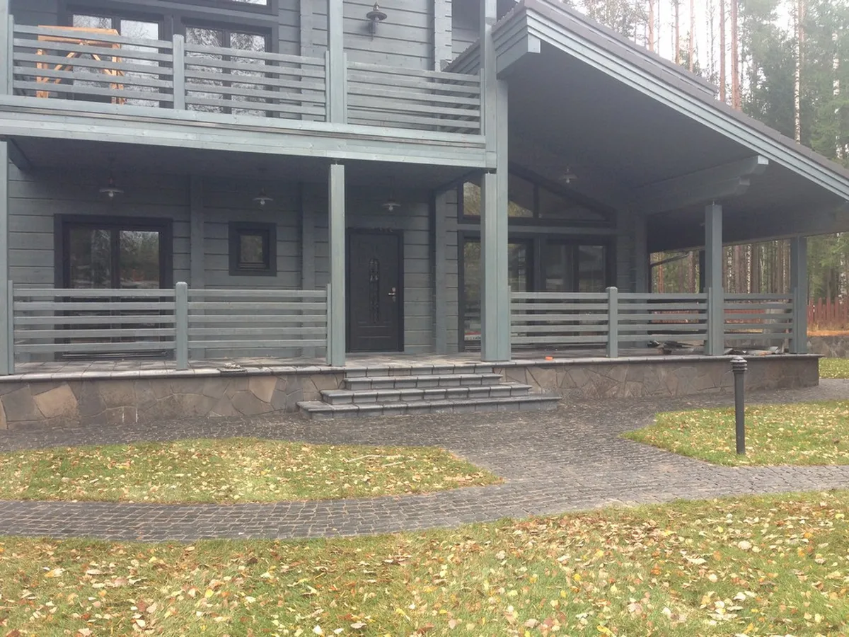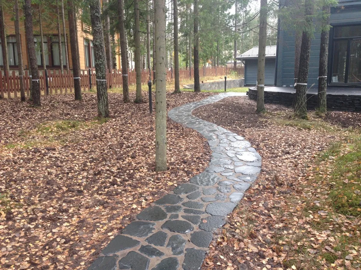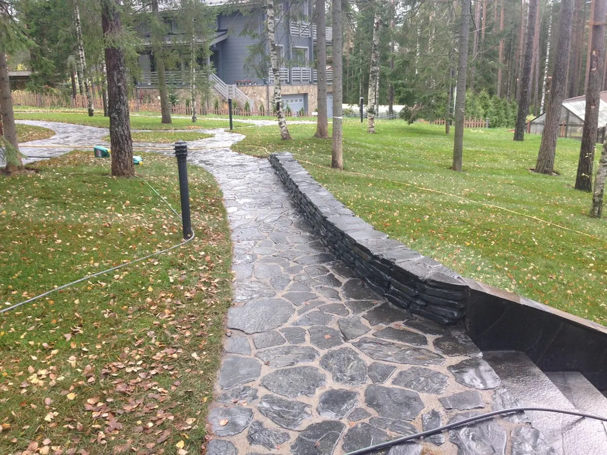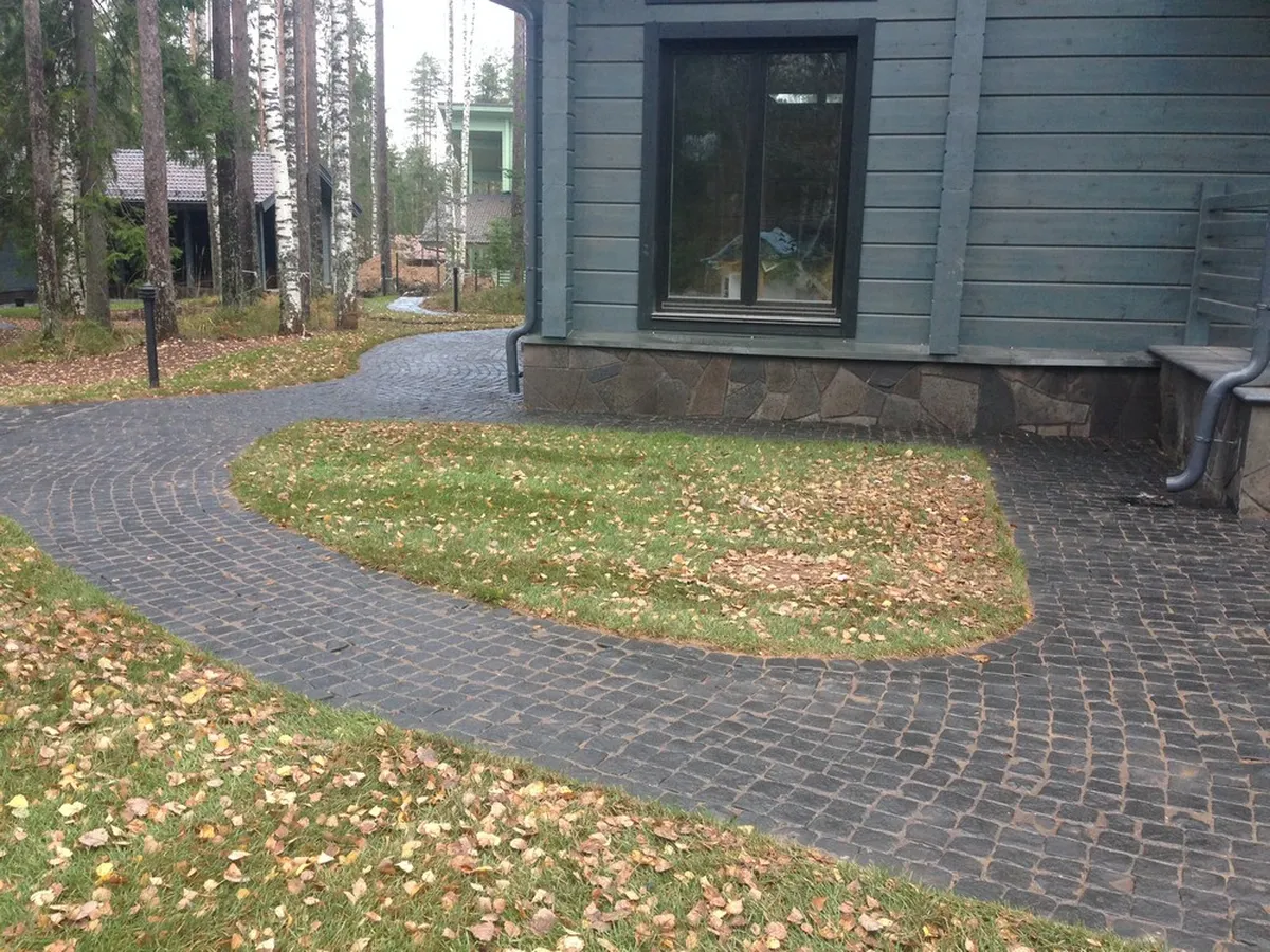 Мощение полностью выполнено из натурального камня, гранитной брусчатки (диабаз) и шунгита (галтованный, рваной формы) в комбинированном варианте.