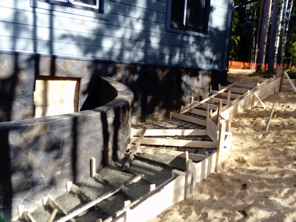 Без лестницы было никак не обойтись. Для ее изготовления была смонтирована опалубка, сделано армирование, произведена заливка бетоном, а после готовая лестница была облицована натуральным камнем (рваный шунгит толщиной 15 – 20 мм).