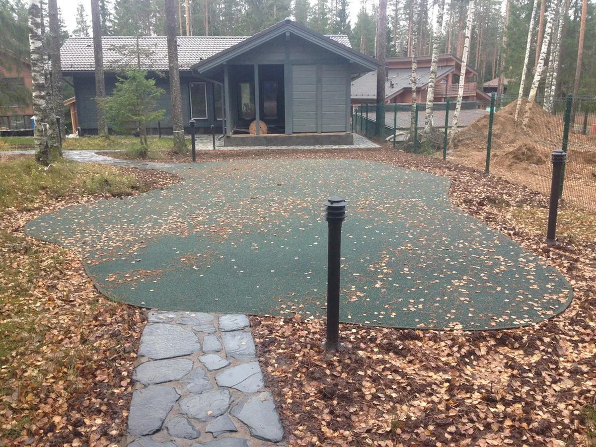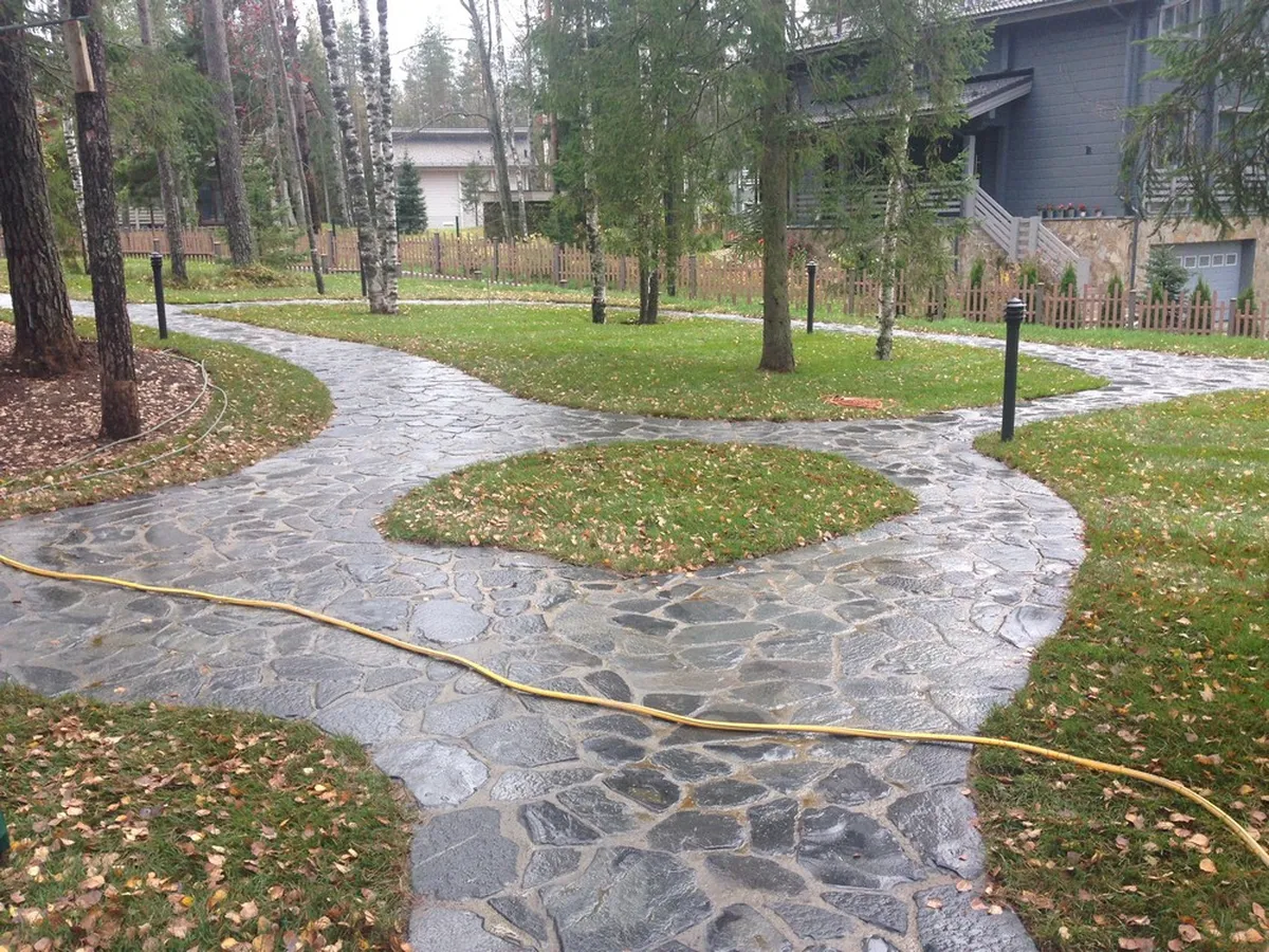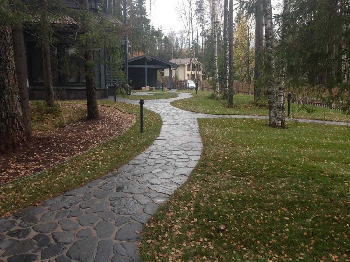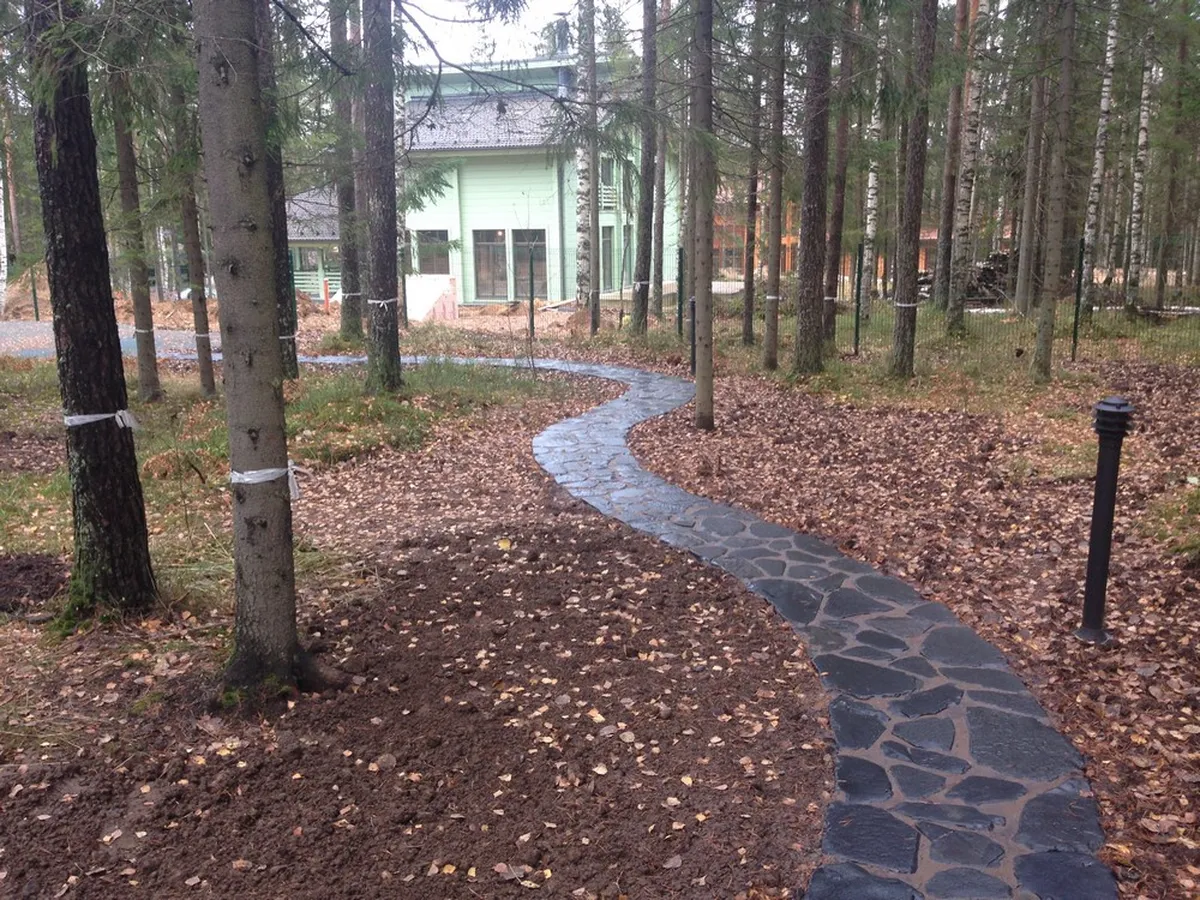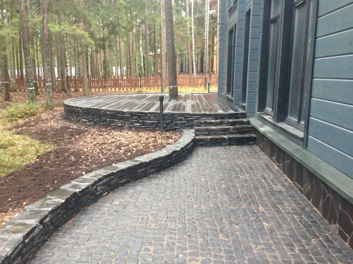 - мощение натуральным камнем (галтованный шунгит с брусчаткой);