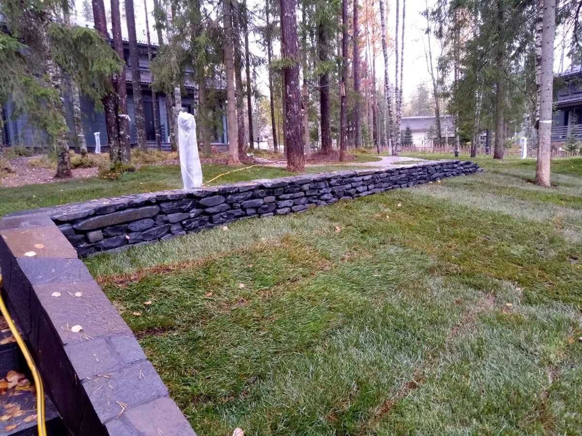 - устройство декоративных подпорных стенок из галтованного шунгита;