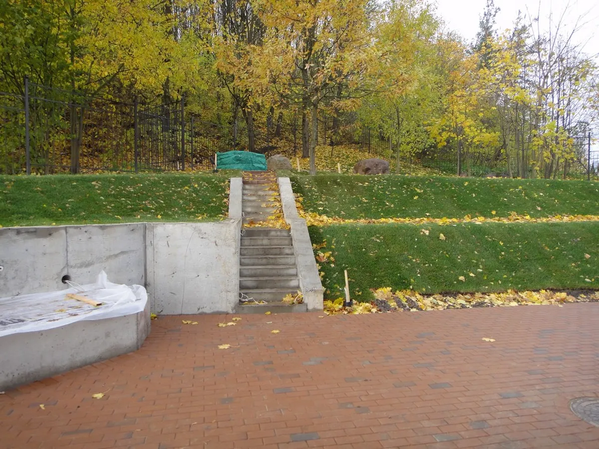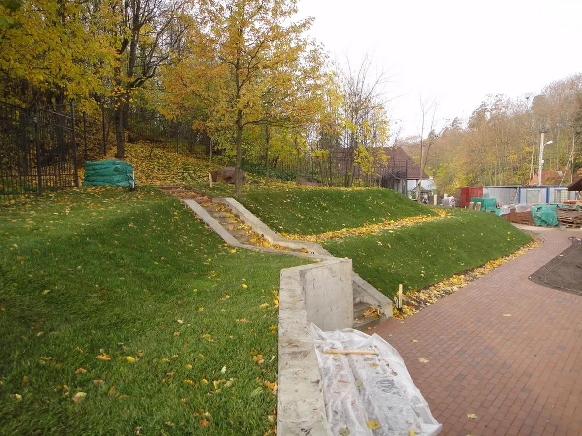 Перед нами стояла задача сформировать склон за счет бетонирования подпорных стен высотой от 1 до 2 м, уложить георешетку, с засыпкой ячеек плодородным грунтом, укатать и уложить рулонный газон.