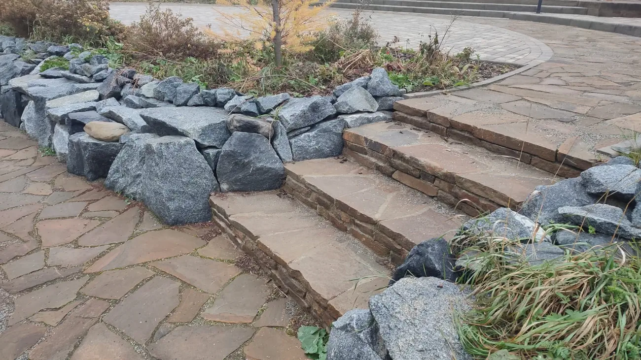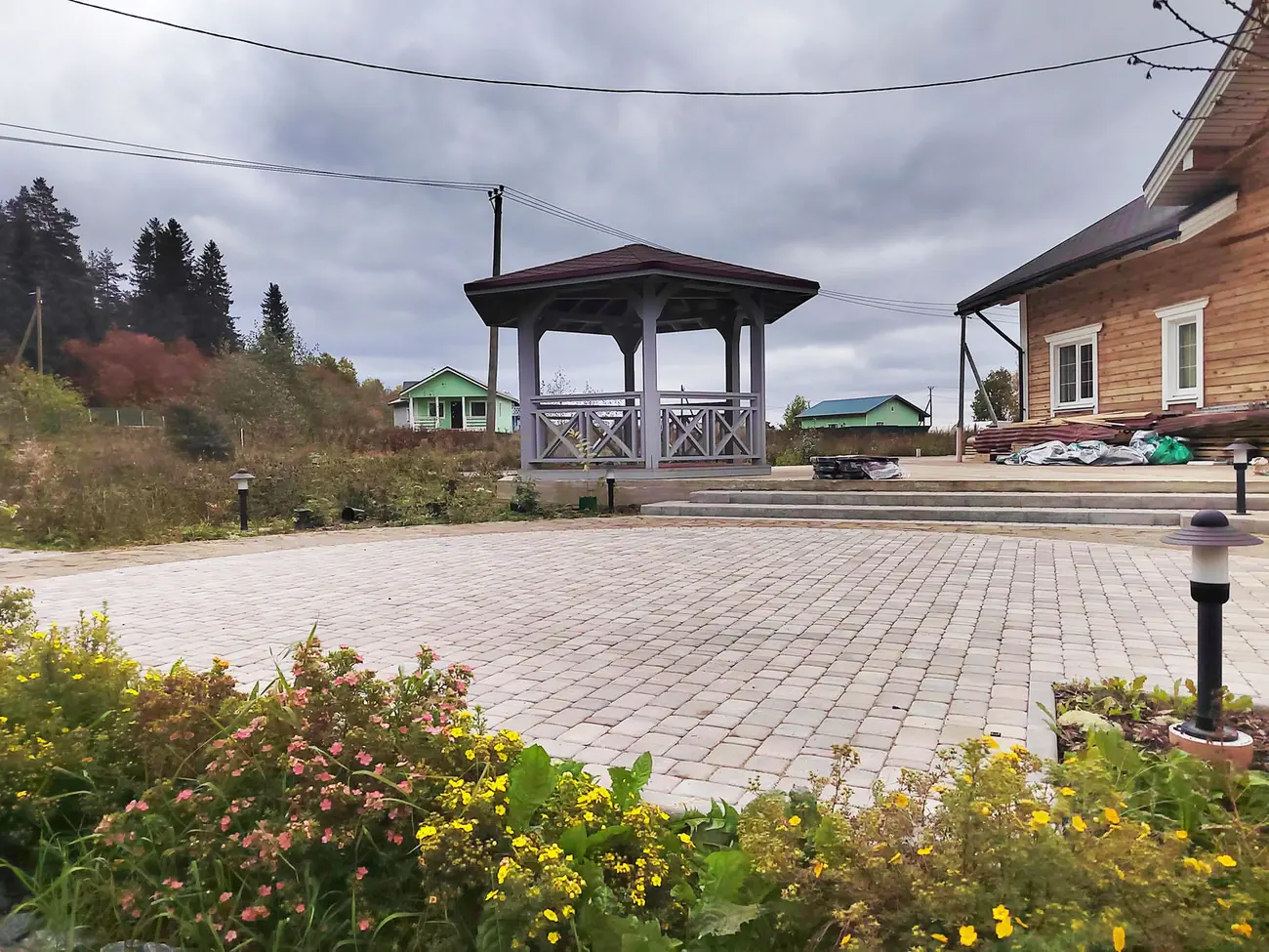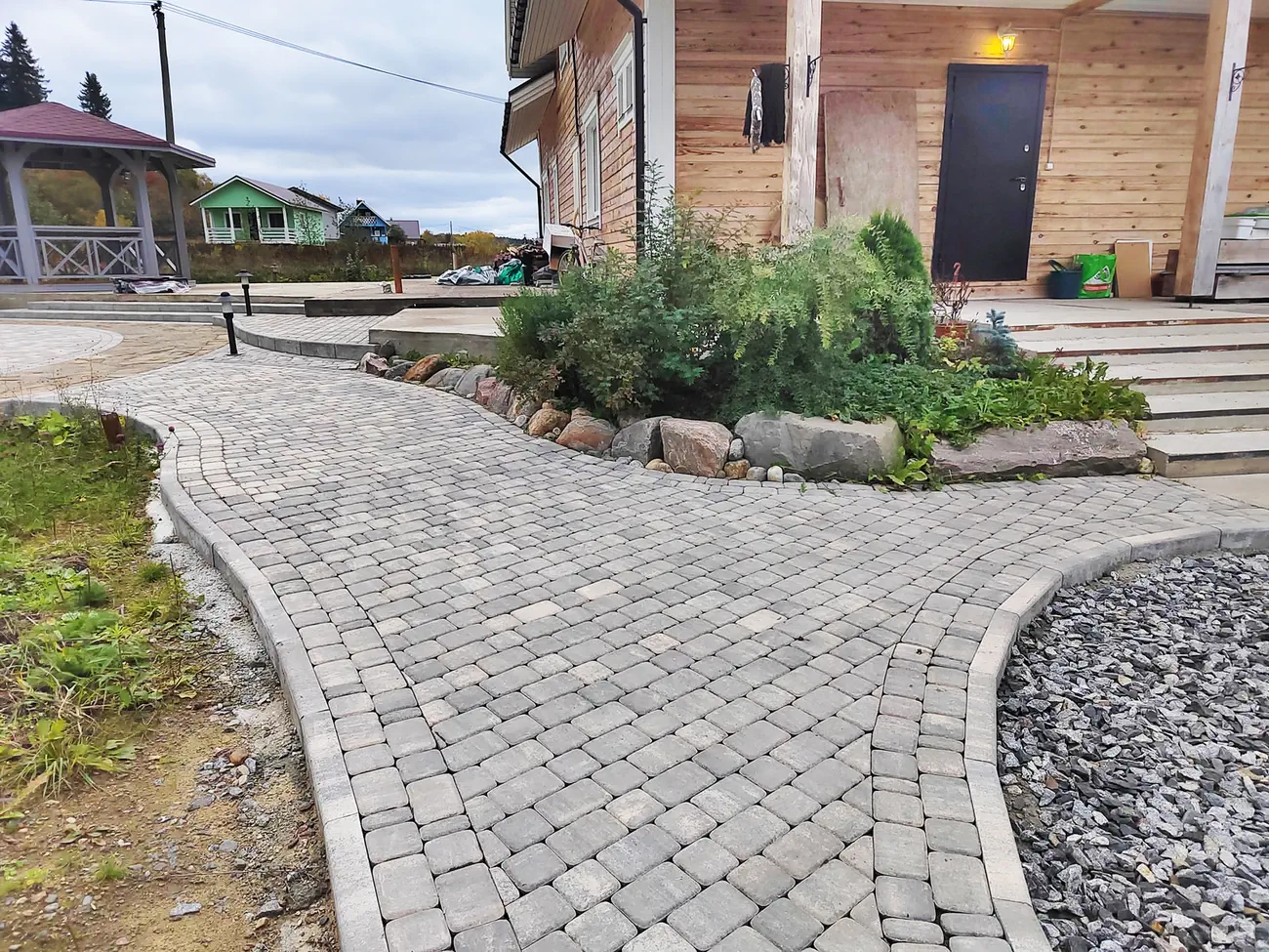 - мощение из тротуарной плитки, гранитной брусчатки, рваным песчаником;