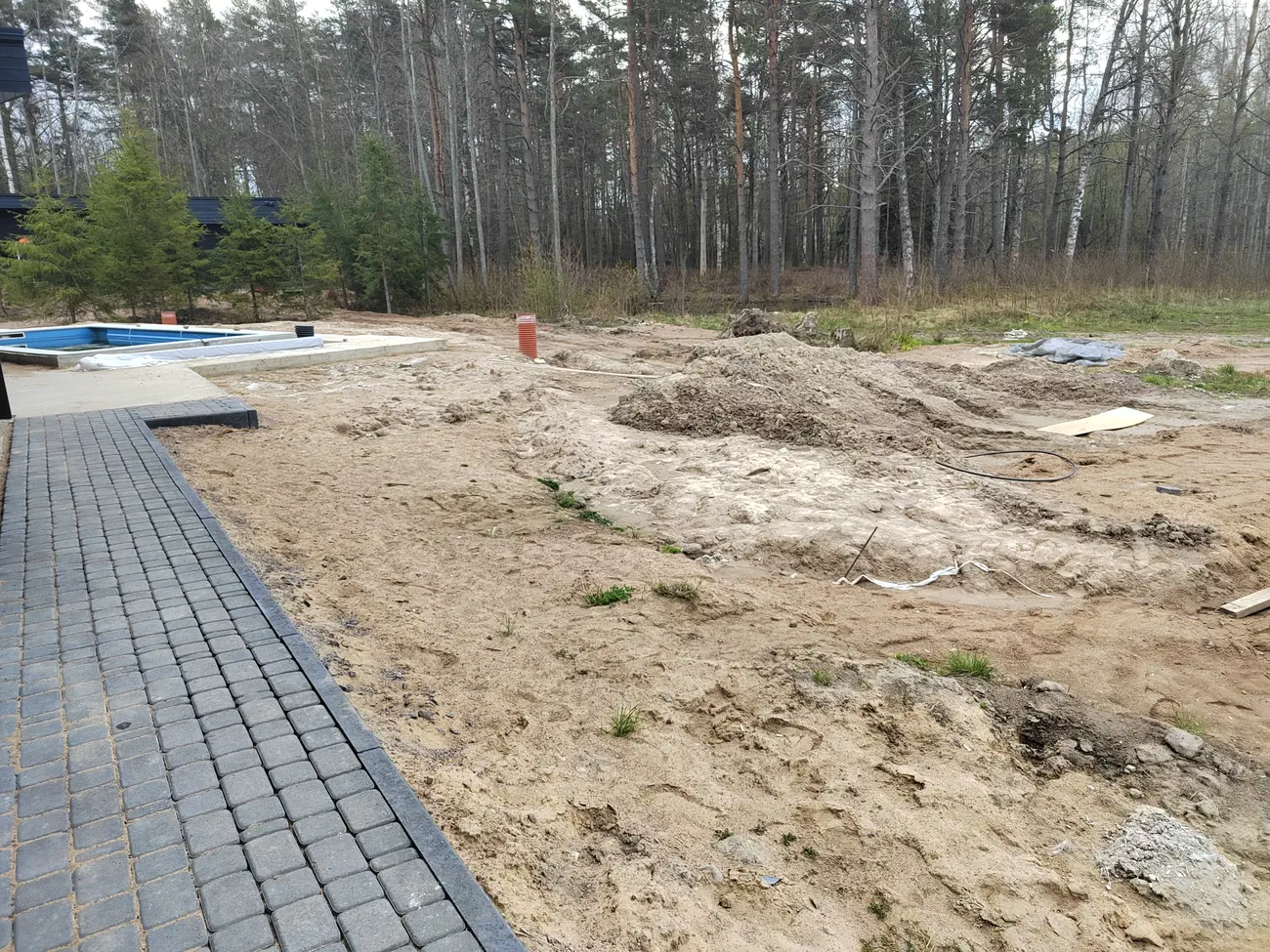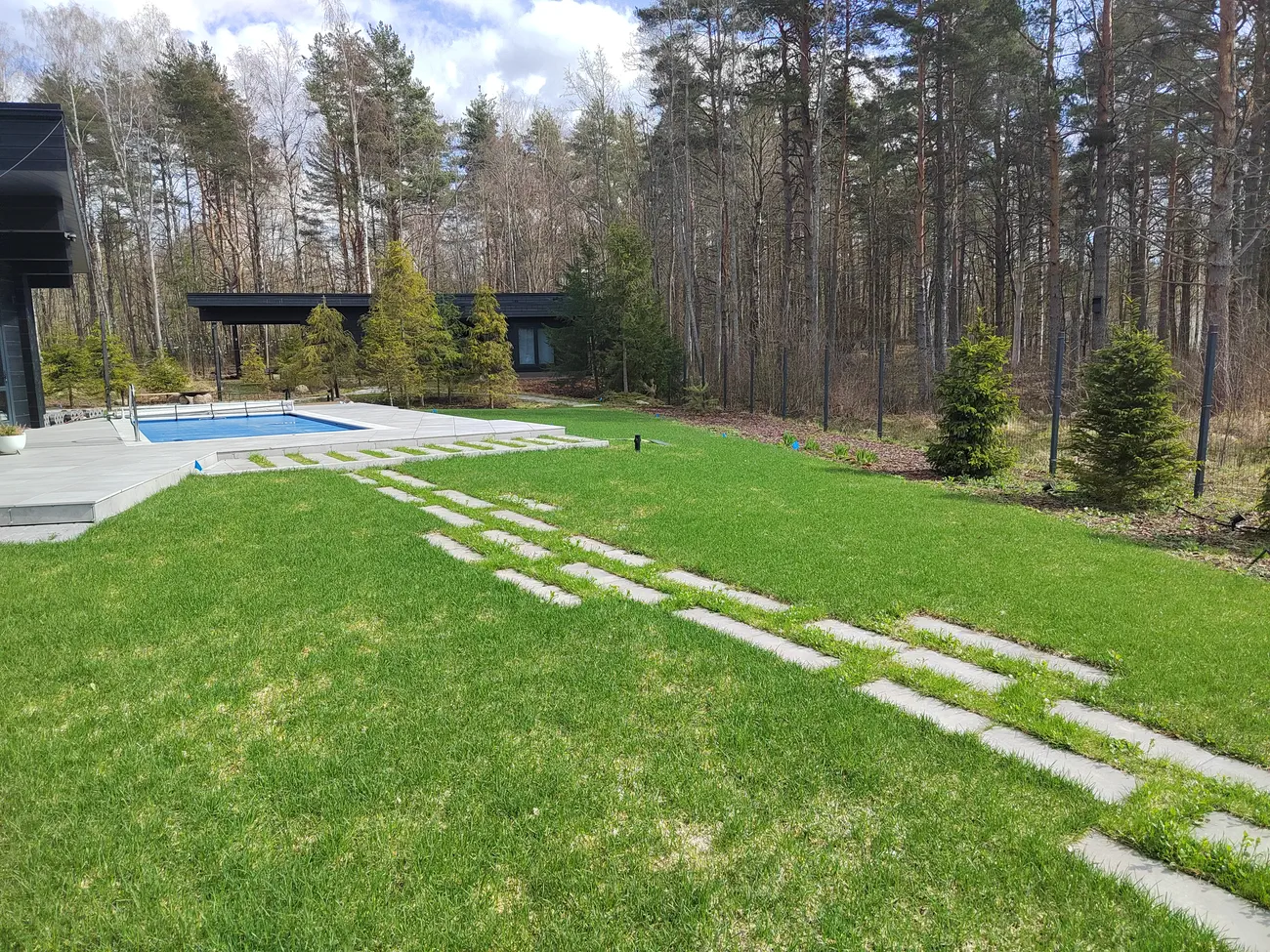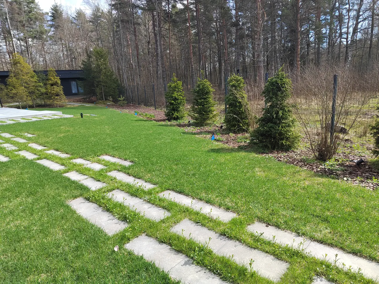 Работы начались с разбивки и вертикальной планировки. На участке имелся плавный склон, который необходимо было спланировать по отметкам, укатать, уложить рулонный газон, посадить растения. Необходимость проведения данных мероприятий было обусловлено тем, что в последующем склон мог быть размыт ливневой водой.