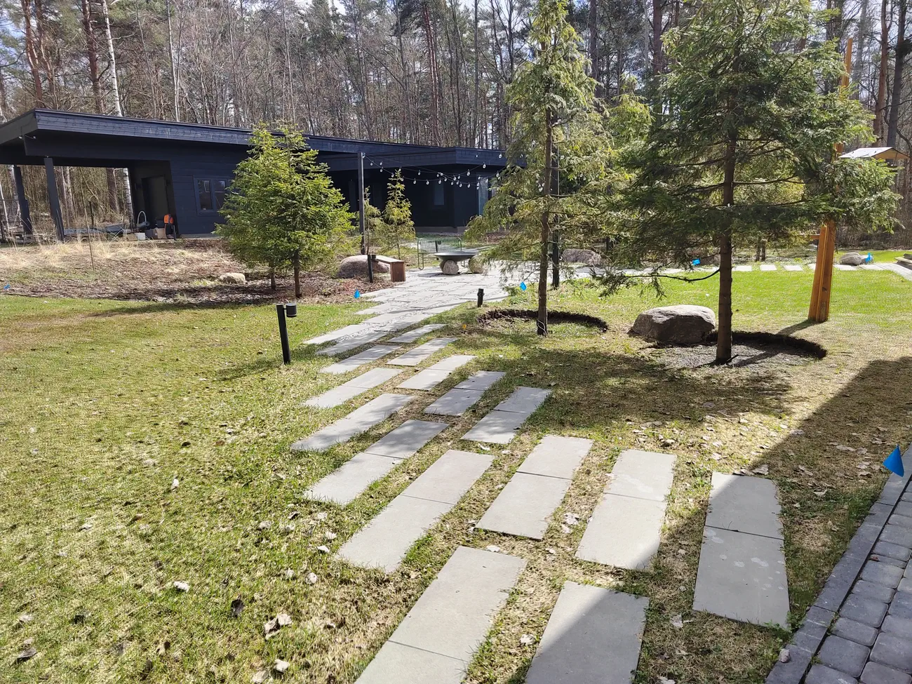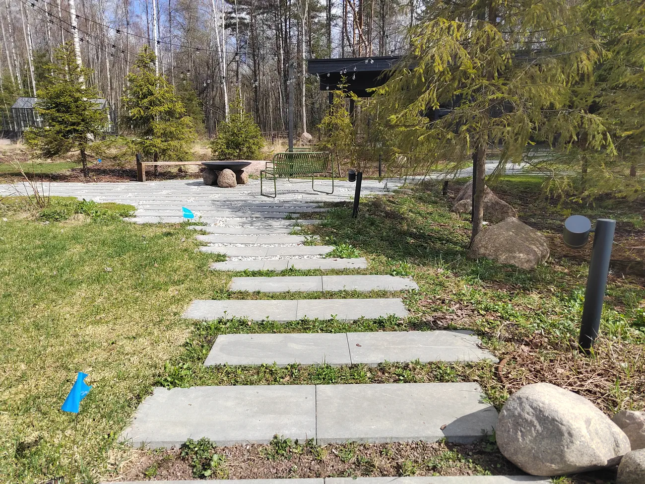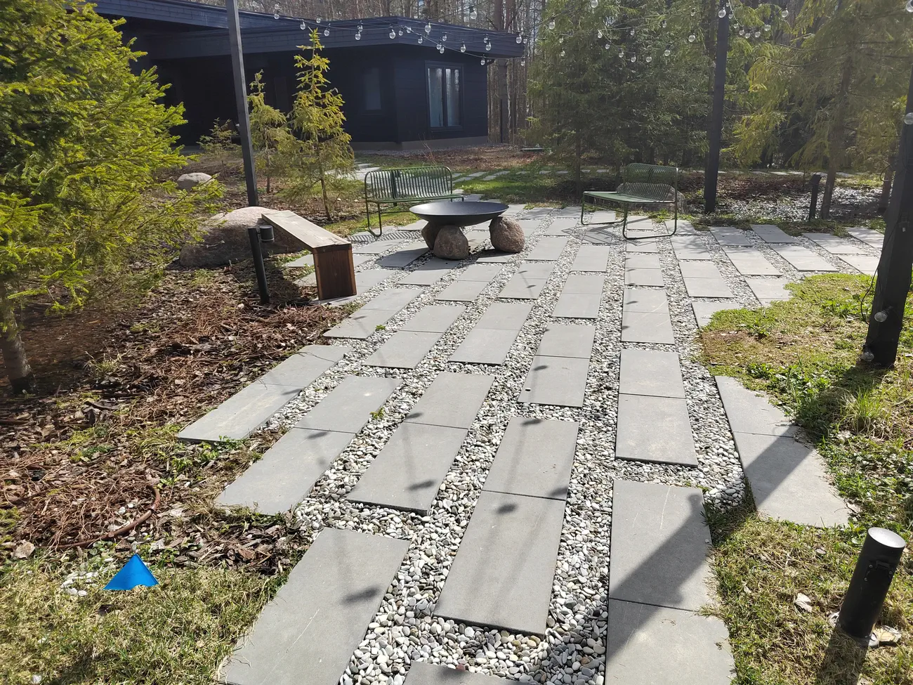 Выполнили дренаж и прокладку труб для ливневой канализации, установили смотровые колодцы, и проложили кабель для освещения участка. Мощение дорожек сделали из крупноформатных бетонных плит, для паркинга и автомобильной дороги на участке использовали тротуарную плитку "Старый Город", в сочетании с бетонной газонной решеткой.