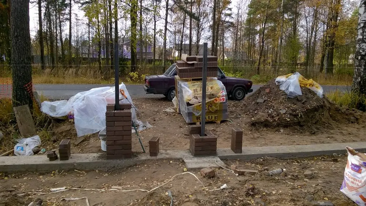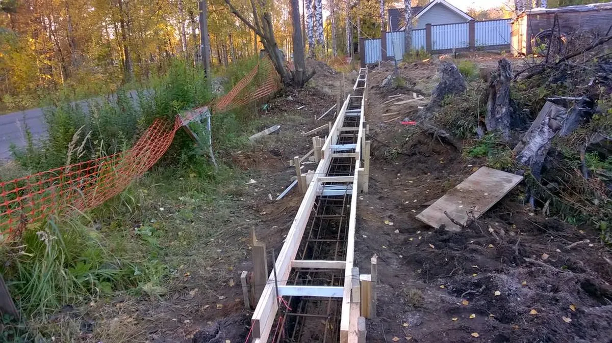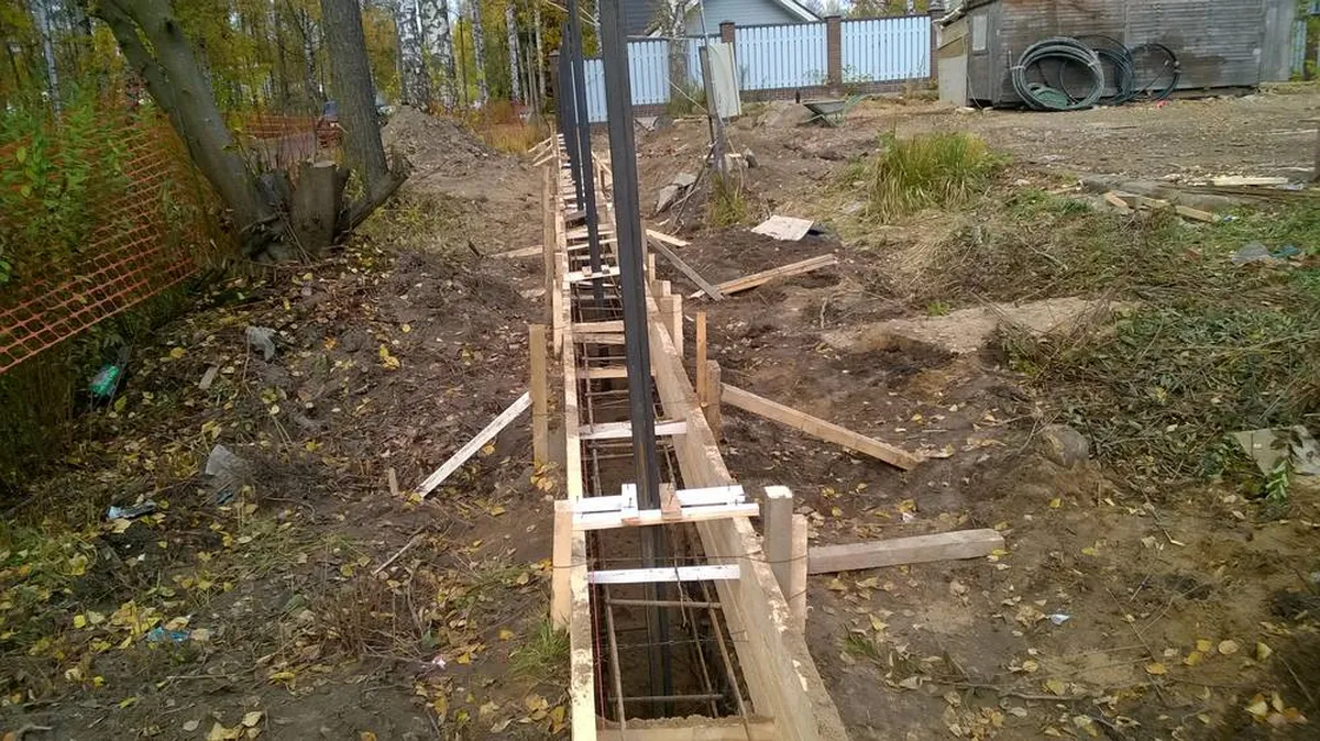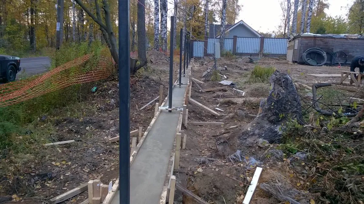 В качестве фундамента под забор использовался ленточный фундамент, так как это оптимальный вариант для тяжелого забора. Перед заливкой бетона была проведена работа по откопке траншеи, засыпке и трамбовке песчаной подушки. Установлена опалубка и выполнено армирование (создали армирующий каркас). Полное затвердевание фундамента проходило 7 дней. После этого был возведен забор.