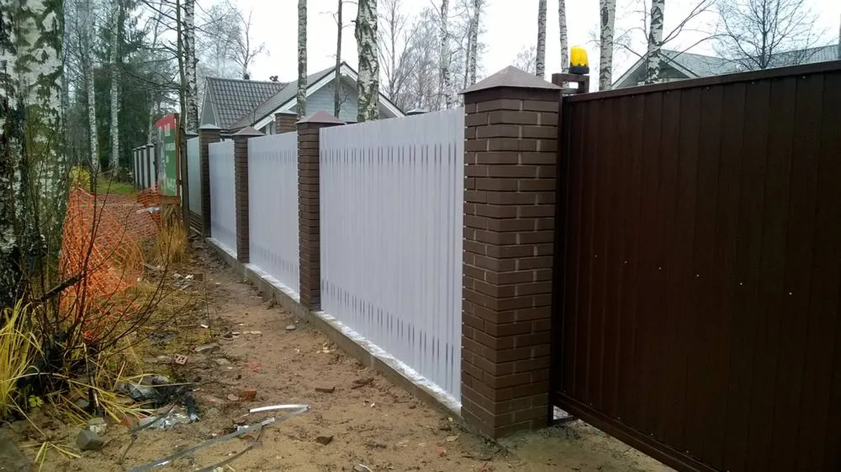 На этом объекте нами выполнялись работы по устройству фасадного забора из кирпича с деревянным заполнением, с монтажом откатных ворот и калитки.