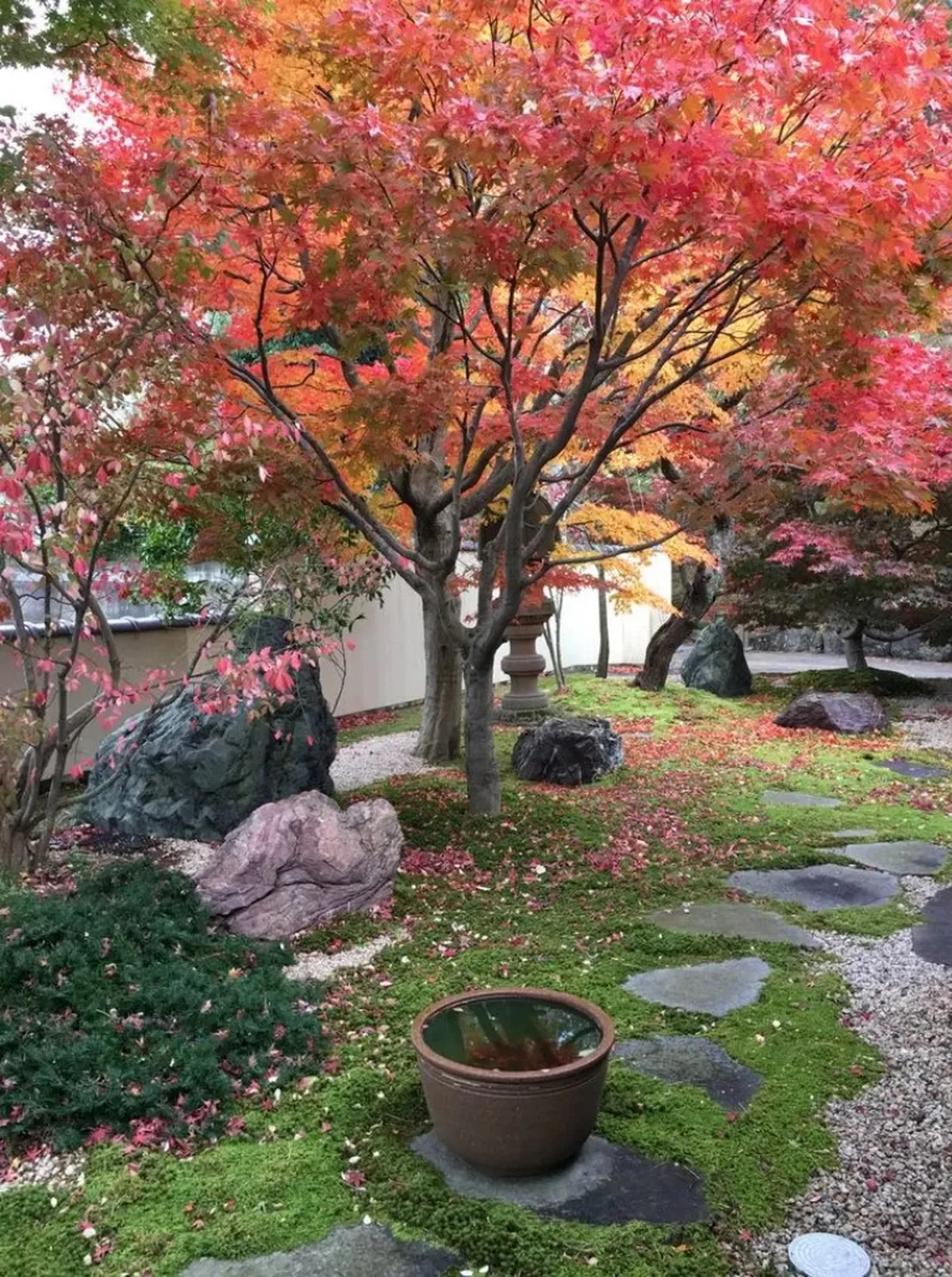 Внушительные размеры этих растений (24 метра в высоту с размахом до 18 метров) также помогают подчеркнуть их осенний цвет. Даже в пасмурный осенний день клены могут освещать двор, как гигантские факелы.