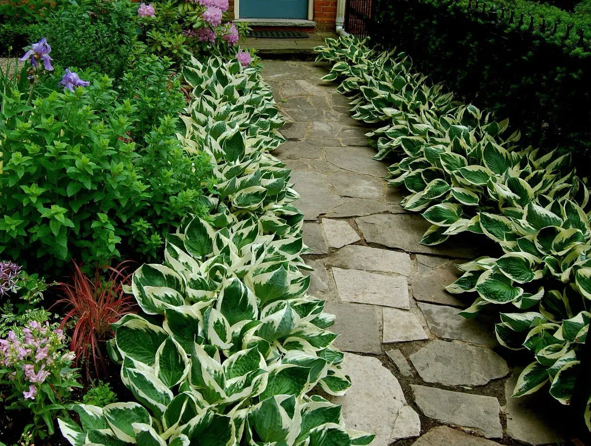 Это является распространенным и популярным решением. Однако необходимо соблюдать некоторые рекомендации. В идеале тропинка должна проходить вдоль восточной или западной стороны дома. Кроме того, лучше всего использовать хосты одного размера. Они не должны быть ни слишком высокими, ни слишком низкими. В идеале использовать один сорт среднего размера. При посадке учитывайте размер зрелой хосты, чтобы ее листья не рассыпались по дорожке и проходящие по ней люди не спотыкались. Растения должны отступать от края тропинки на половину диаметра взрослого экземпляра.