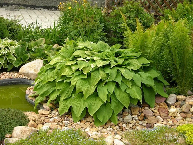 Крупные хосты также прекрасно смотрятся в качестве самостоятельных растений у водоемов, на фоне тенистых цветников или в качестве акцентов в садах природного стиля с декоративными травами, эхинацеями, золотарником, гелениумами, тысячелистником и т. д. В этих условиях они будут выделяться.