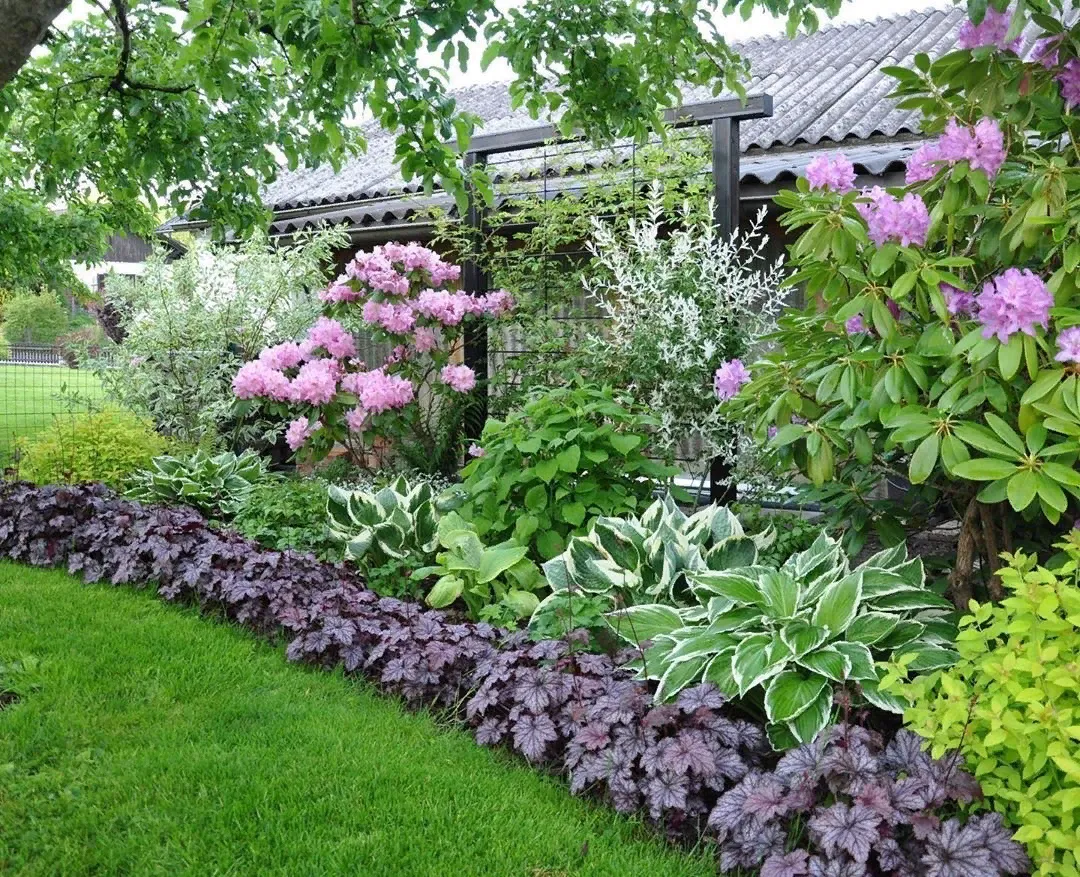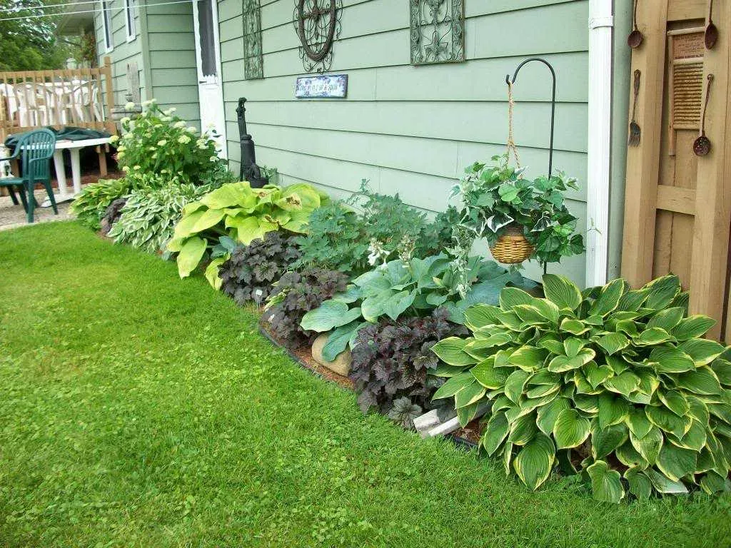 Это еще одна тенистая зона на участке, которая зачастую остается пустой. Чтобы украсить ее, на клумбе сзади дома можно посадить хосту в качестве самостоятельной посадки, либо разбавить ее колокольчиками, валерианой, ирисом, пеларгонией.