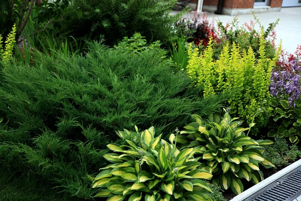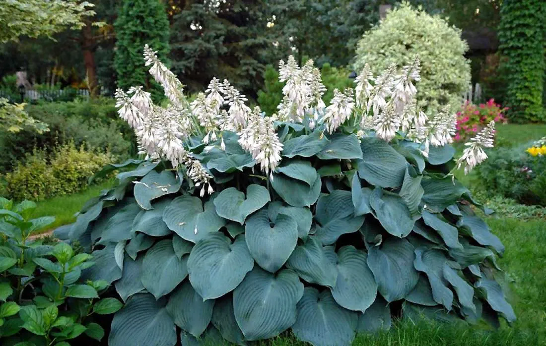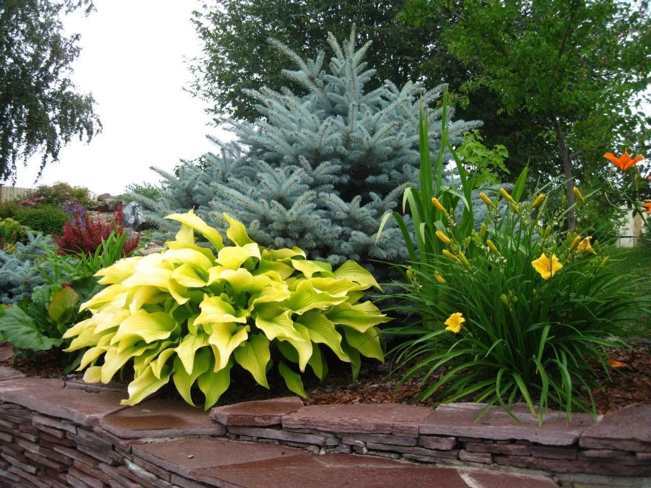 Хвойные деревья, такие как ель, можжевельник, шелковица, сосна, часто высаживают вместе с хостами. Эти два вида растений хорошо дополняют друг друга, создавая прекрасный фон для ярко цветущих экземпляров.