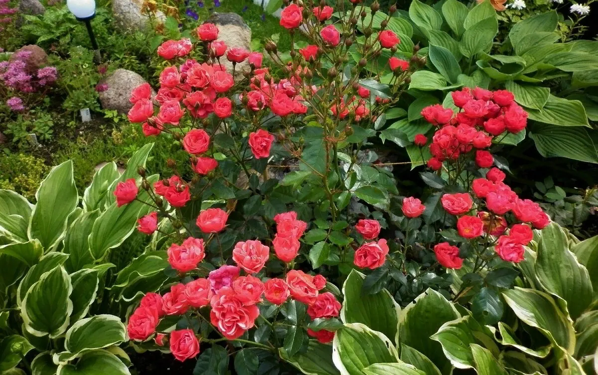 - Старайтесь размещать хосты таким образом, чтобы в полдень их могли притенять либо близлежащие деревья, либо сами кусты роз.