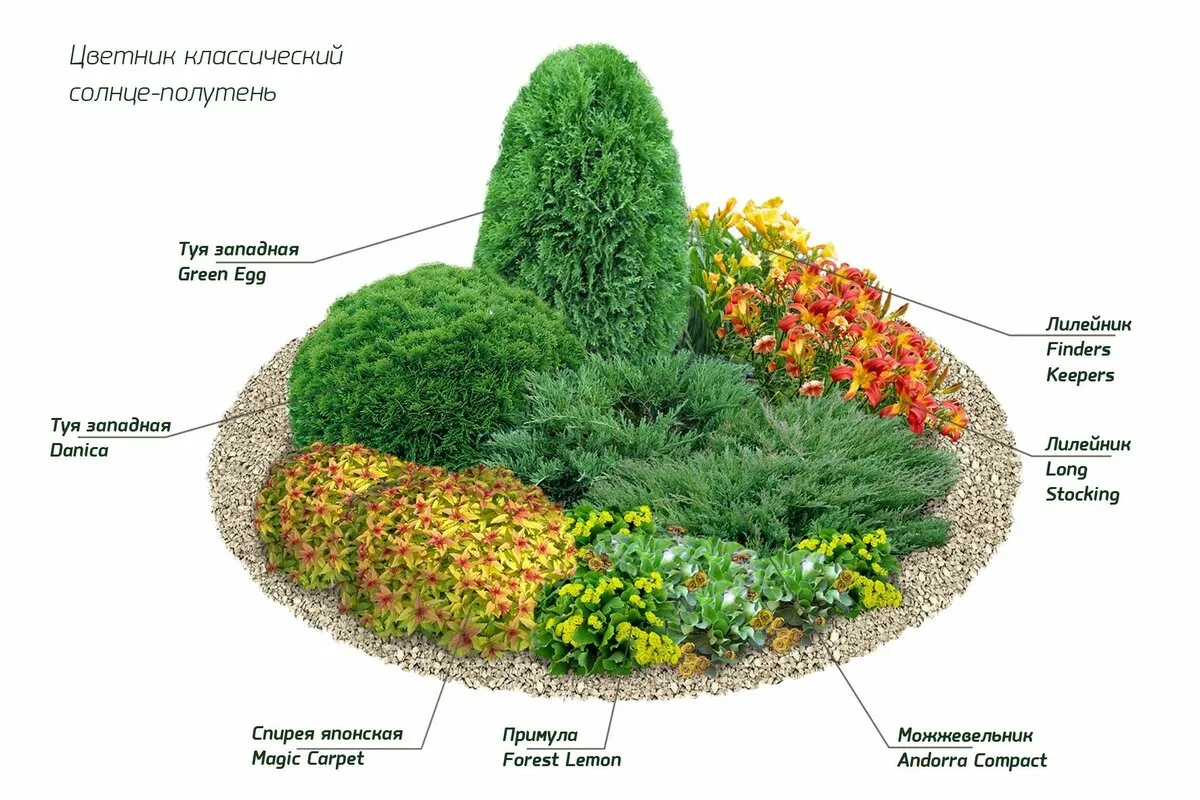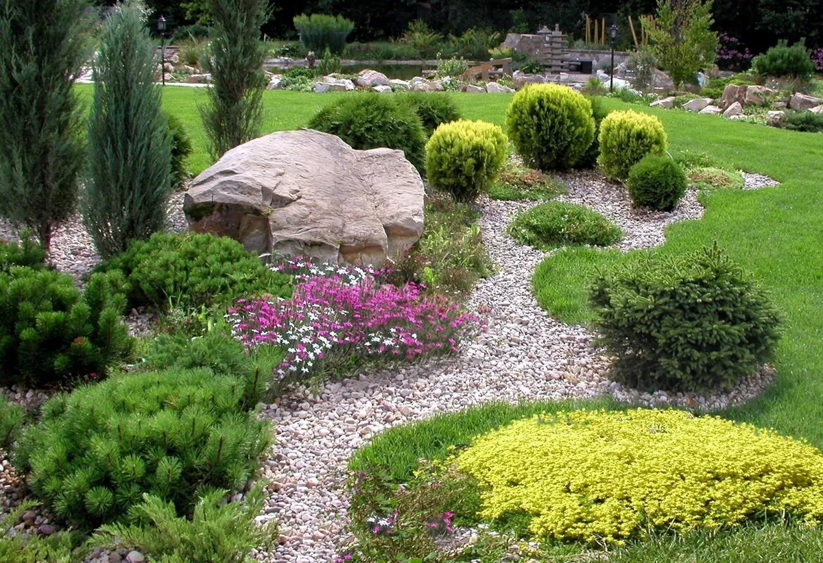 Центровым объектом становятся высокие культуры, а низкорослые занимают места по краям. Хвойные кустарники внесут изюминку в оформление. Гравий и галька завершат и дополнят образ.