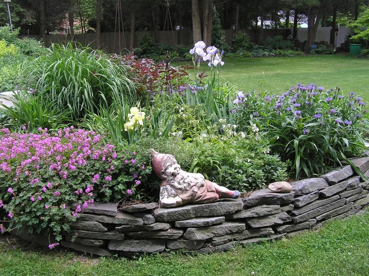Такой вариант хорош тем, что за растениями удобней ухаживать, так как не придется лишний раз наклоняться для прополки или посадки. Для возведения используется камень, который отлично сохранит форму цветника и удержит ее вес.