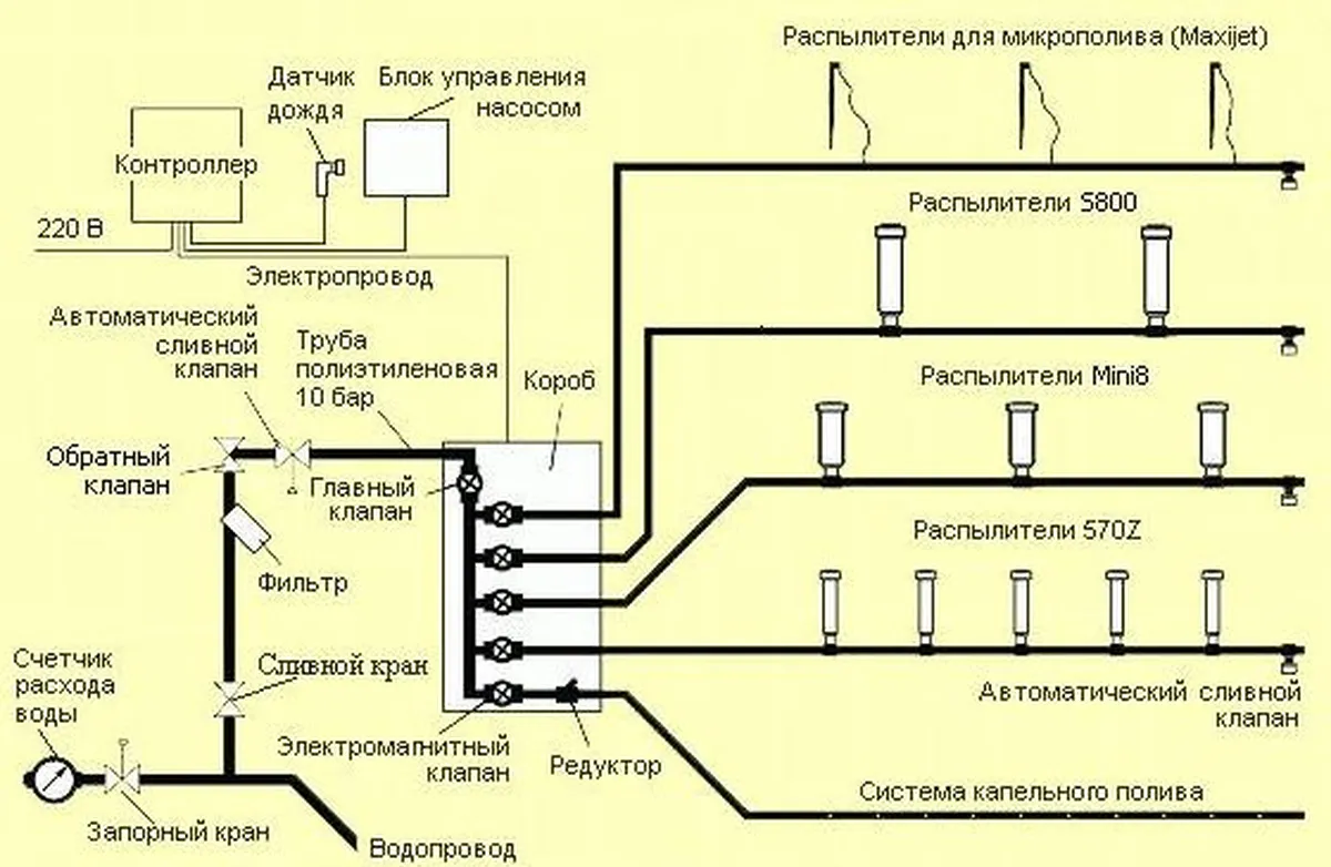 Основные конструктивные элементы, комбинированной (капельной и дождевой системы) установки автоматического полива представлены на схеме.