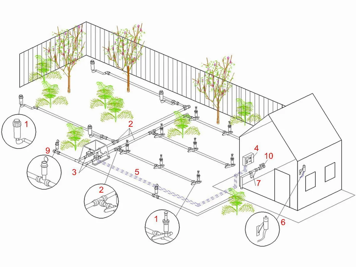 Схема автополива создается на плане участка. Здесь прорисовываются трассы магистральных трубопроводов. Если планируется создавать зону дождевого полива, то на схеме необходимо обозначить места установки дождевателей, а также радиус их действия.