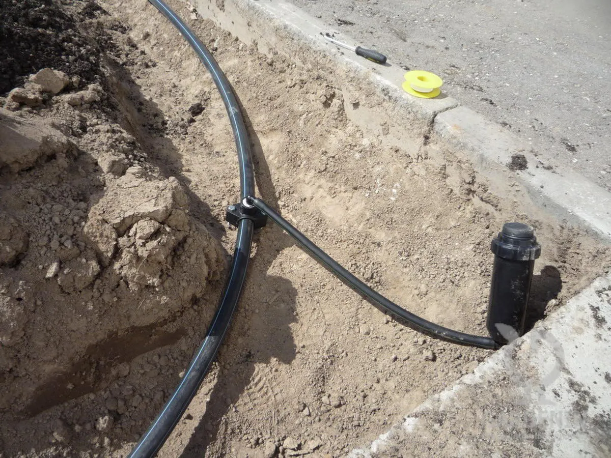 - Под землей – устраивается на участках постоянного проживания. Трубы в этом случае прокладываются на глубину не менее 30 см. Это делается для того, чтобы их невозможно было повредить мотоблоком, культиватором или лопатой.
