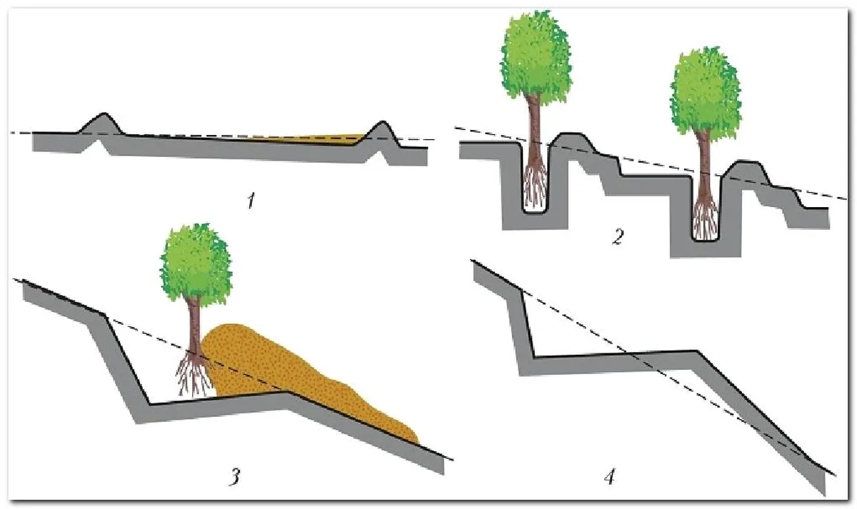 - Террасы-канавы - устраивают на склонах крутизной от 35 до 40 градусов. Вынимают слой почвы из ливневых канав и формируют земляные валы. Каждый вал должен быть выше, чем предыдущий на два метра.