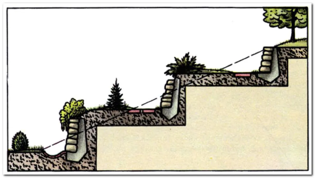 - Ступенчатые - для склонов с углом от 8 до 12 градусов. Каждую ступень обычно делают от 3 до 15 метров в ширину и укрепляют при помощи кладки из камня.