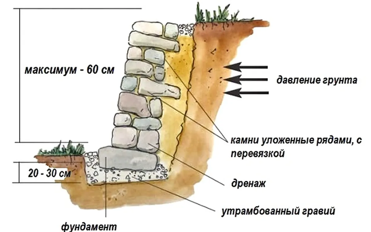 Строительство опорных стенок следует начинать с нижней части склона. Для увеличения прочности и срока службы подпорных конструкций их располагают с некоторым уклоном к откосу, а не строго вертикально. Очень важно соблюсти соотношение высоты и ширины опорной стены 3 к 1.
