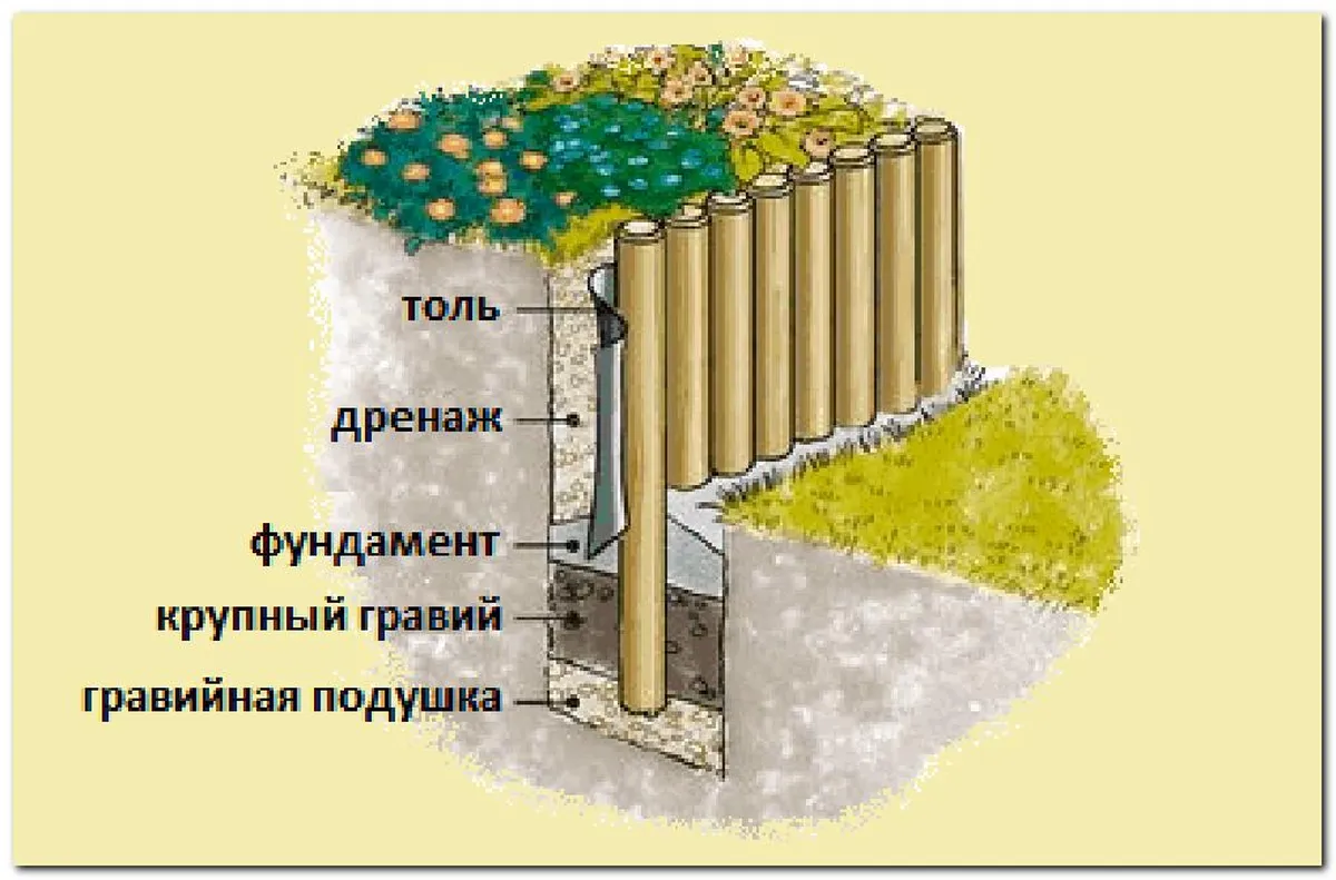 Ширина выемки должна быть шире диаметра брёвен на 20 сантиметров. После этого на её дно насыпают и утрамбовывают щебень. Брёвна располагают вплотную друг к другу. Засыпают оставшуюся ямку ещё одним слоем щебня, заливают бетоном и присыпают почвой.