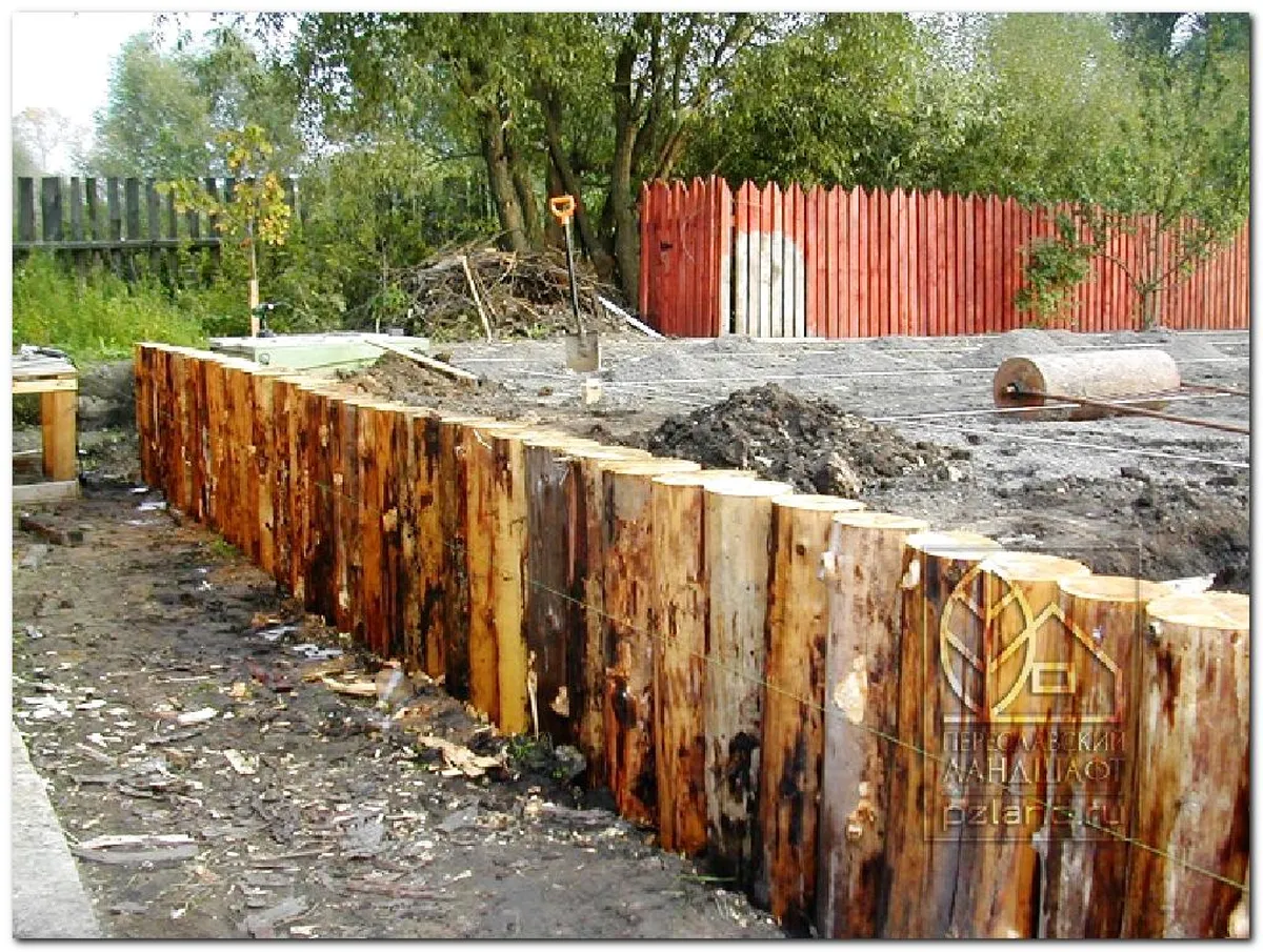 Для сооружения подпорной конструкции из древесины вдоль линии откоса делают выемку на 15 сантиметров глубже, чем та часть брёвен, которую планируется закопать в землю.