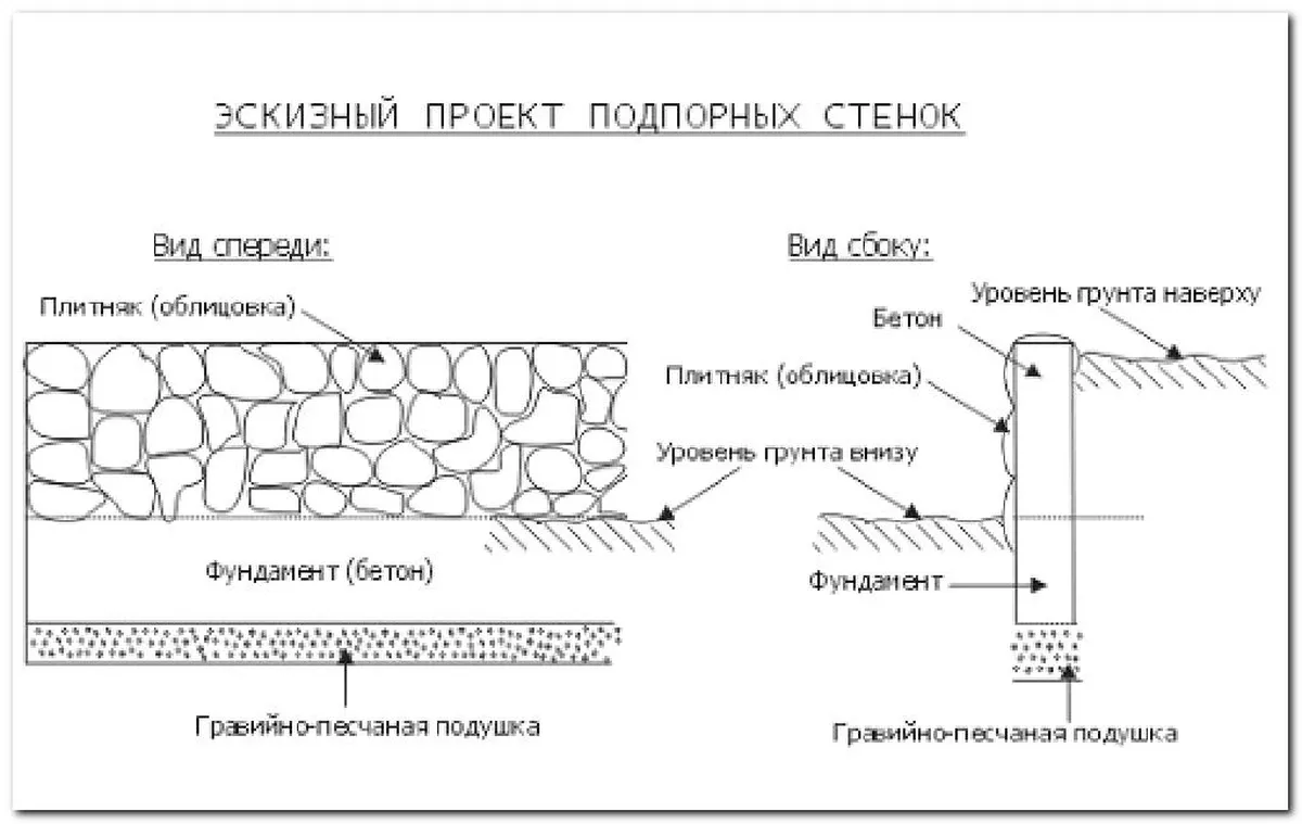 При использовании подпорок из бетона нужна деревянная опалубка. В неё послойно насыпают гравий и камни, заливая каждый слой бетоном. В такой конструкции важно не забыть проложить на высоте 5 сантиметров дренажную трубу для оттока воды.