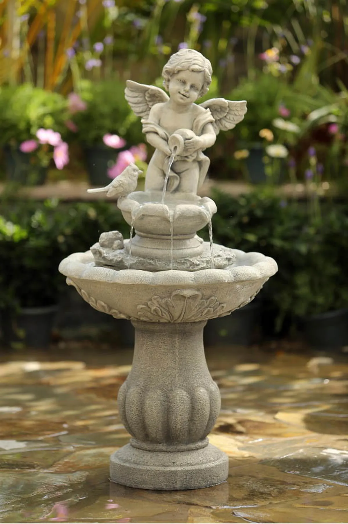 Отдельно стоящий фонтан более сложен в установке. К тому же к самой «фигуре» фонтана необходимо приобрести кроме насоса и специальную насадку.